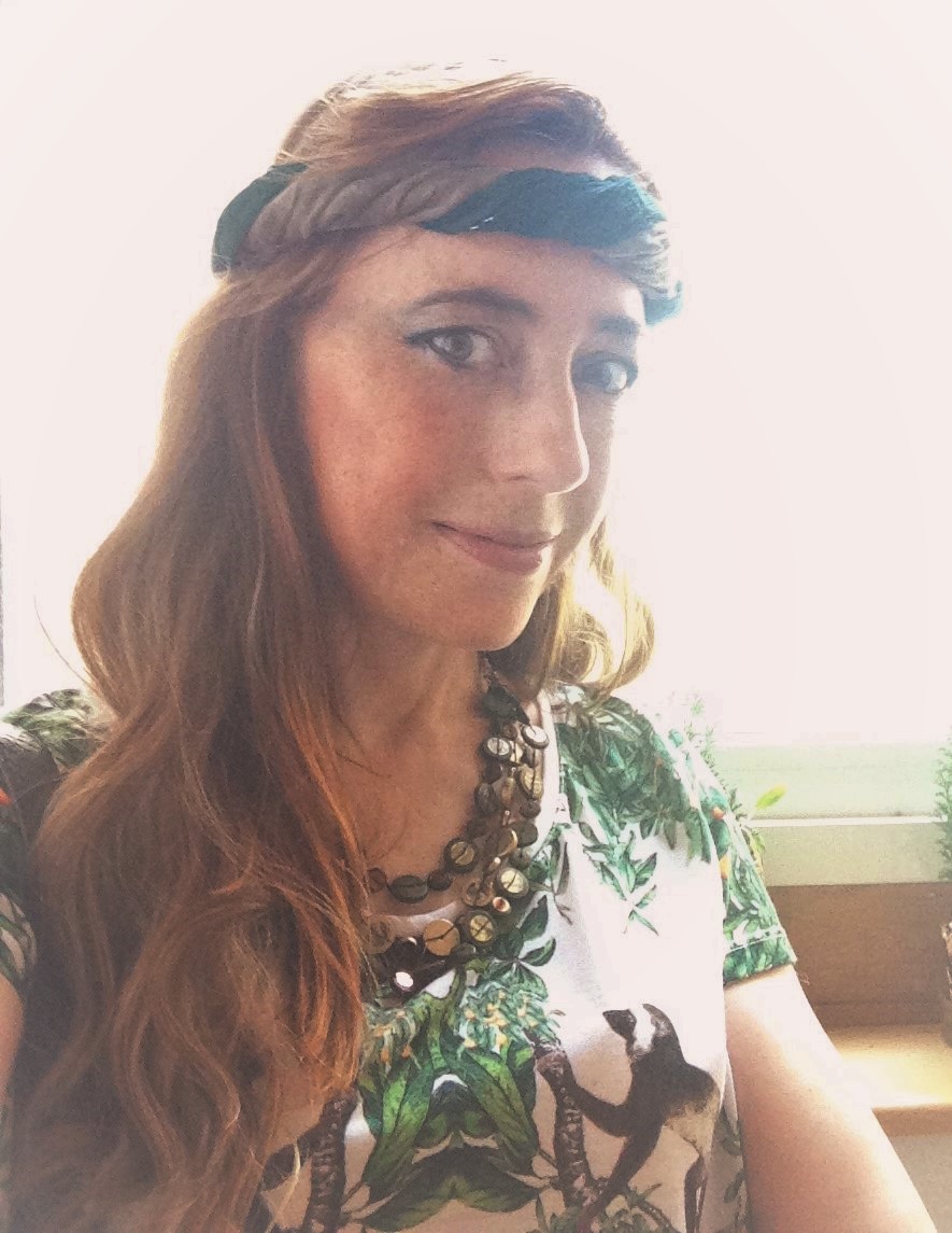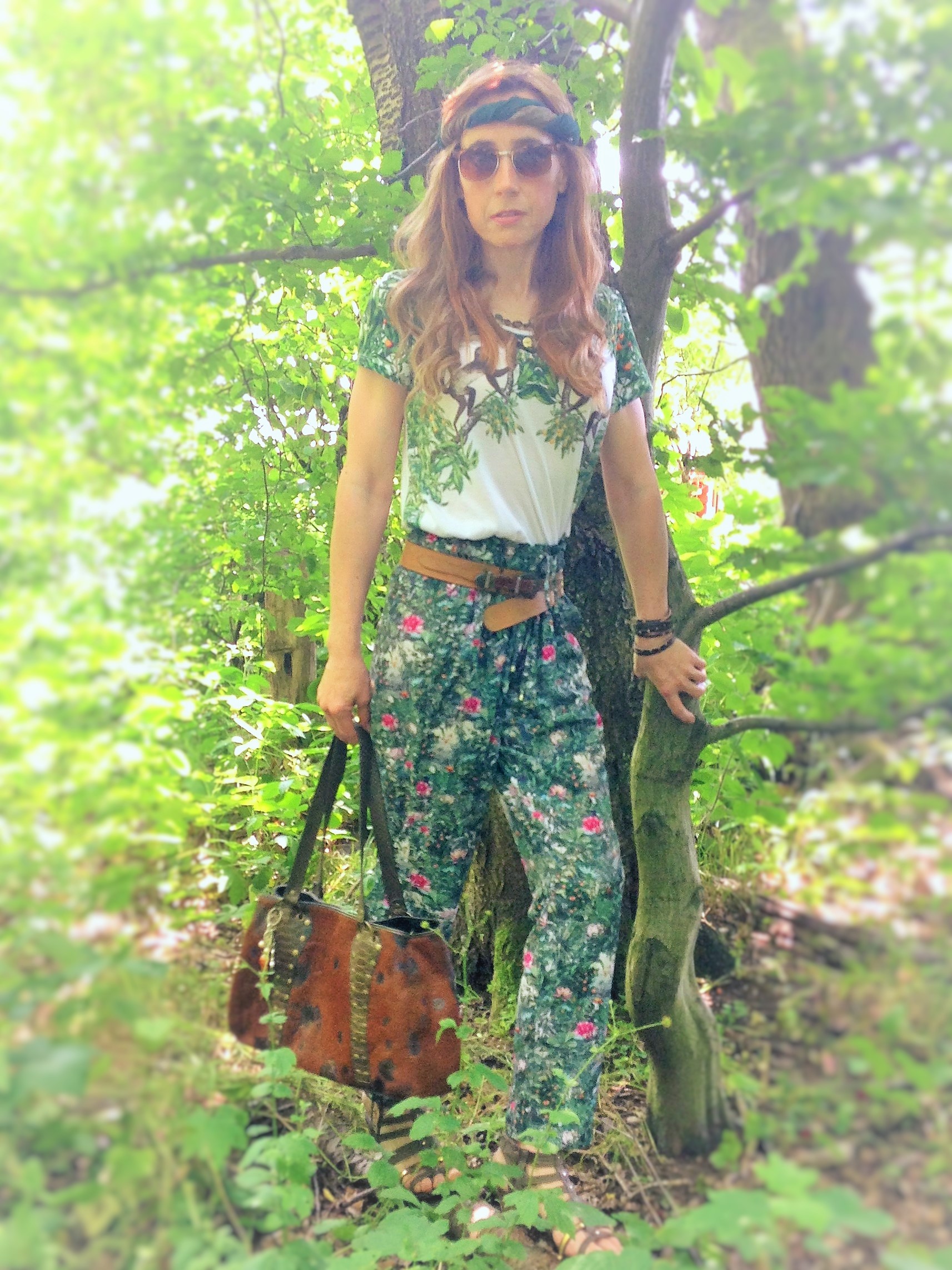 Die Hose ist aus einem sehr leichten, bügelfreien Viscose-Material und hat einen Gummizugbund. Das T-Shirt ist aus Baumwolle und nicht zu eng geschnitten. Die Sandalen sind die, die ich selber „verschönt“ habe (siehe auch den Artikel unter „Kreatives“). Das Tuch ist aus zwei Grüntönen und hat am Rand aufgenähte Münzen. Wenn es kälter wird, ist es super als Schal. Mit einer unifarbenen Jacke kann man den Look auch gut im Herbst oder Frühling tragen. Die Tasche ist aus rustikalem Fellimitat, die Schlangenlederoptik peppt das ganze noch auf. Der Ledergürtel ist gebraucht von ebay. Er ist auf raffinierte Weise zweifarbig doppelt gearbeitet und wird von mir einfach über der Hose getragen. Die Retro-Sonnenbrille in Hornoptik passt farblich gut, ohne zu dominant zu wirken. Das Wickelarmband ist mit Nieten besetzt und rundet das Ganze ab. Beim Make up habe ich mit Bronze-Tönen nachgeholfen, um den Naturlook zu unterstreichen. Ansonsten ist es eher dezent gehalten. So, nun viel Spaß mit den Bildern – vielleicht sind ja ein paar Anregungen für Euch dabei…