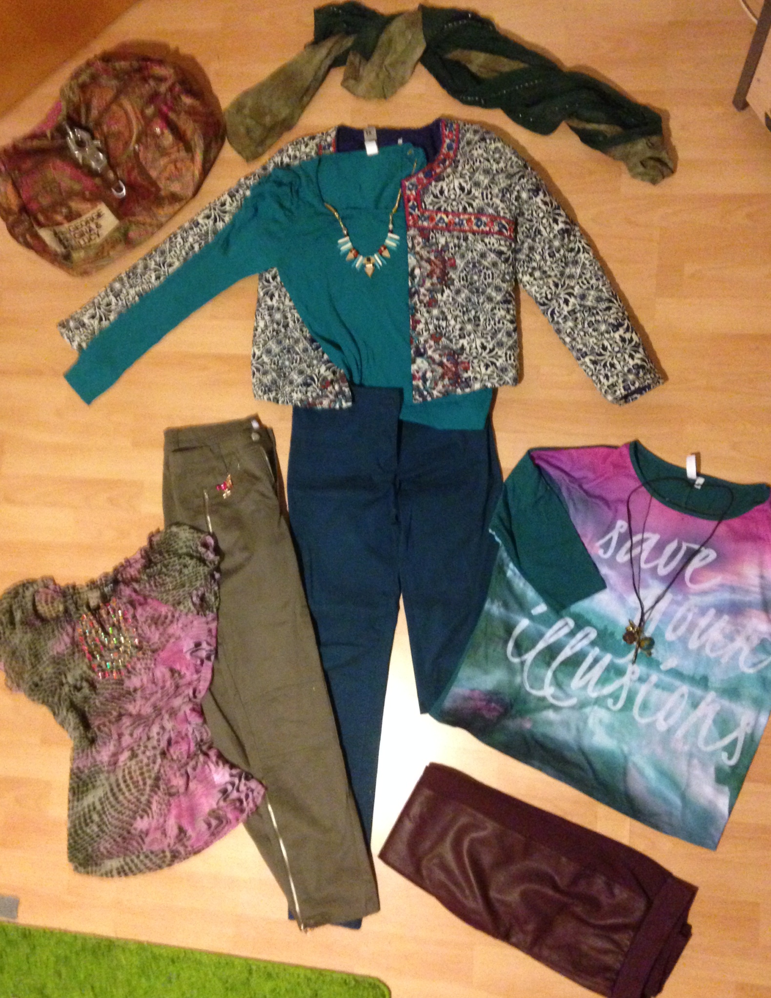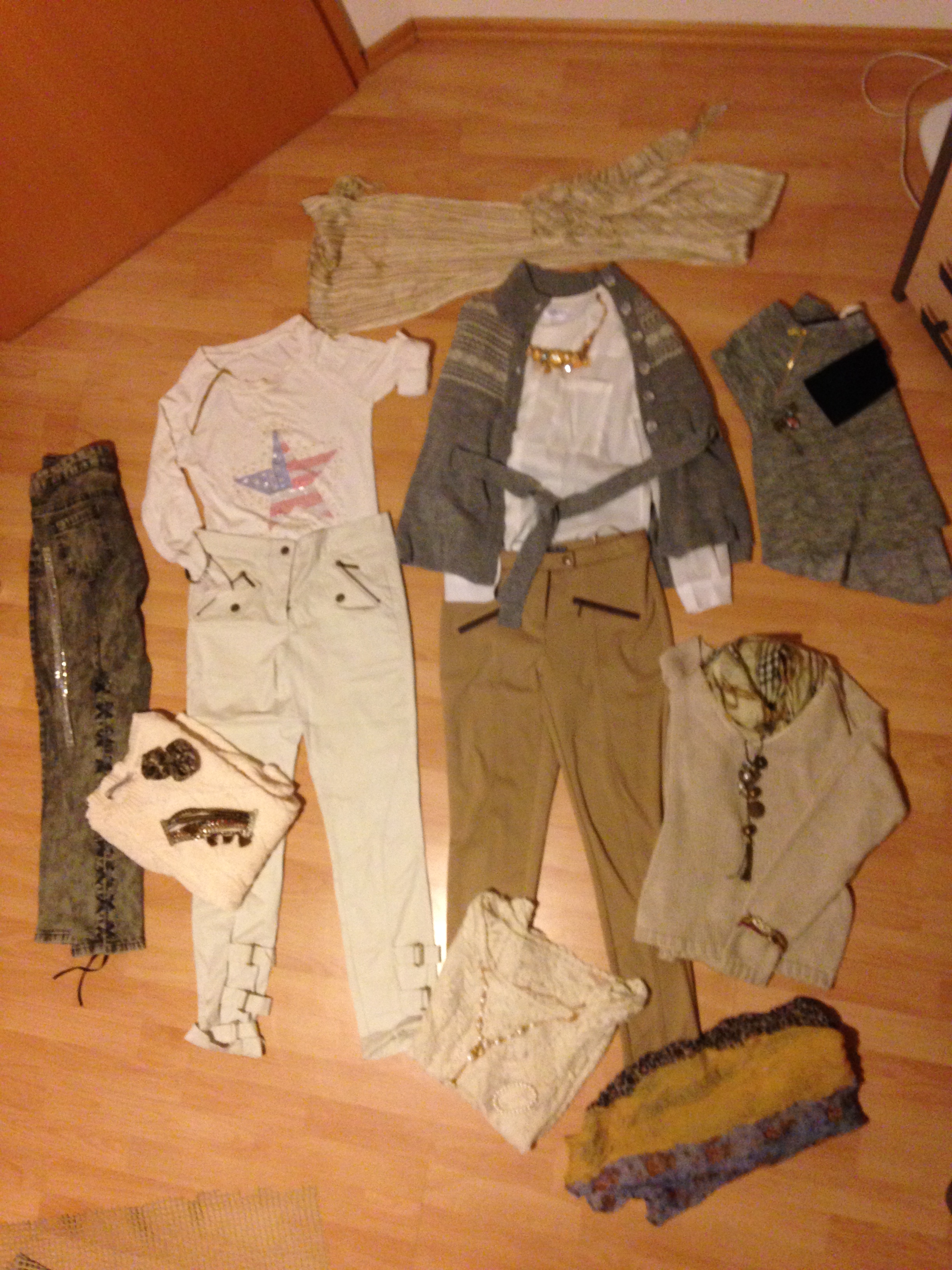 Im folgenden habe ich Euch noch ein paar Farbgruppen/Kombis fotografiert, die zum Teil aus neuen und älteren Teilen bestehen. Mit passendem Schmuck/Accessoires kann man immer neue Looks kreieren. Vielleicht habt Ihr ja Lust, das bei “ Saisonwechsel“ auch bei Euch zu machen. Man sieht, was fehlt, was gar nicht mehr geht und was man sich wirklich leisten möchte. Vielleicht gibt´s ja einen Wunsch, den Ihr immer schon wolltet. Wenn man überlegt, ob man wirklich die zwölfte Strickjacke braucht oder die Socken doch regelmäßig sortiert, anstatt wegen lauter Singel-Socken ständig neue zu kaufen… Außerdem macht es Spaß und man behält den Überblick. Hier und da ein wohlüberlegtes neues Teilchen macht dann gleich viel mehr Spaß,,,