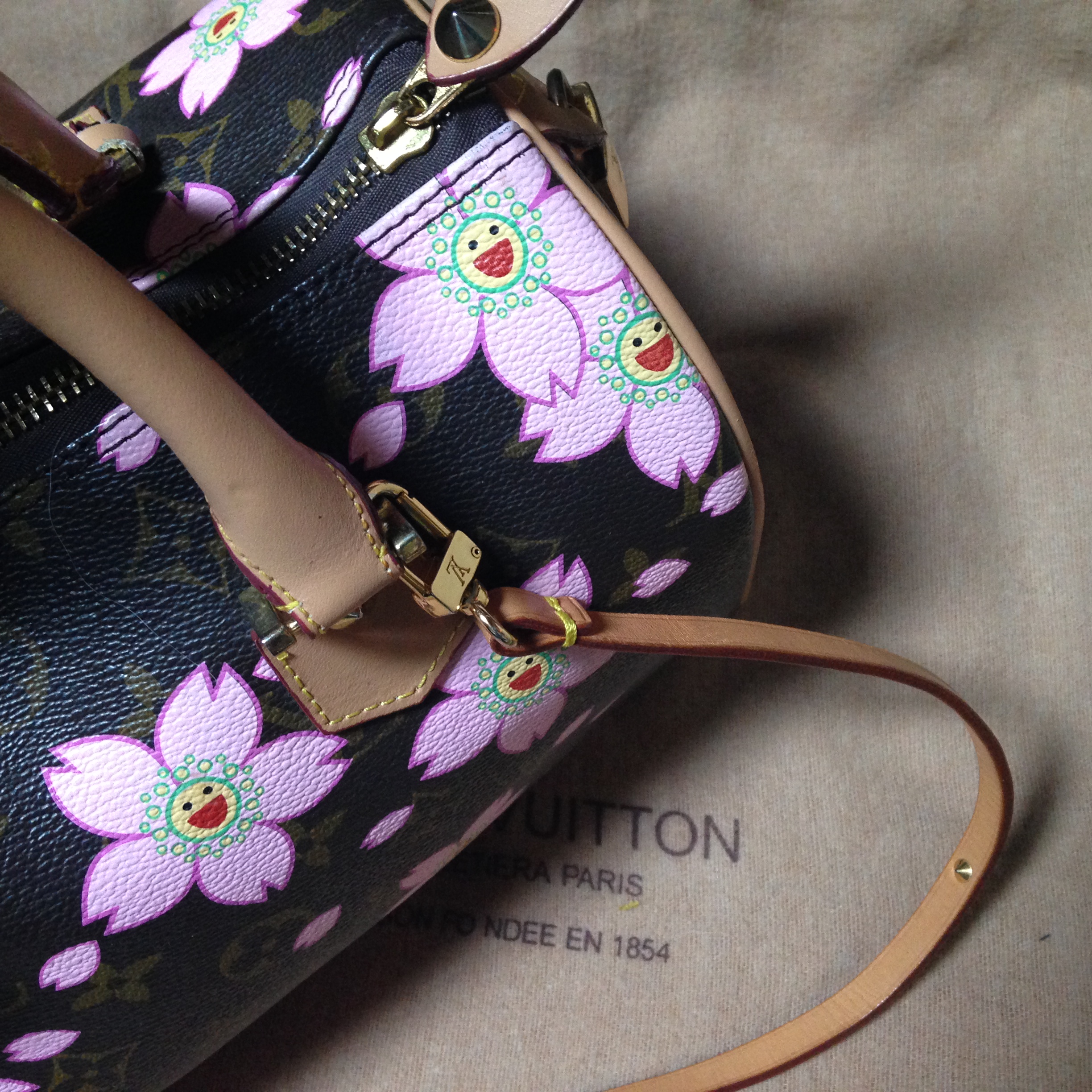 Die Louis Vuitton Speedy im Blossom Murakami Design ist schon ein paar Jährchen alt. Ich finde sie lustig, und das witzigste daran ist, dass dir meisten Leute sie für falsch halten, weil sie das Design nicht kennen. Ergänzt ist übrigens der lange Trageriemen, den ich mir bei LV extra gekauft habe, weil ich gerne die Hände freihabe.Sie wurde diagonal geclipt, so ist sie immer im Gleichgewicht (was nie verkehrt ist).