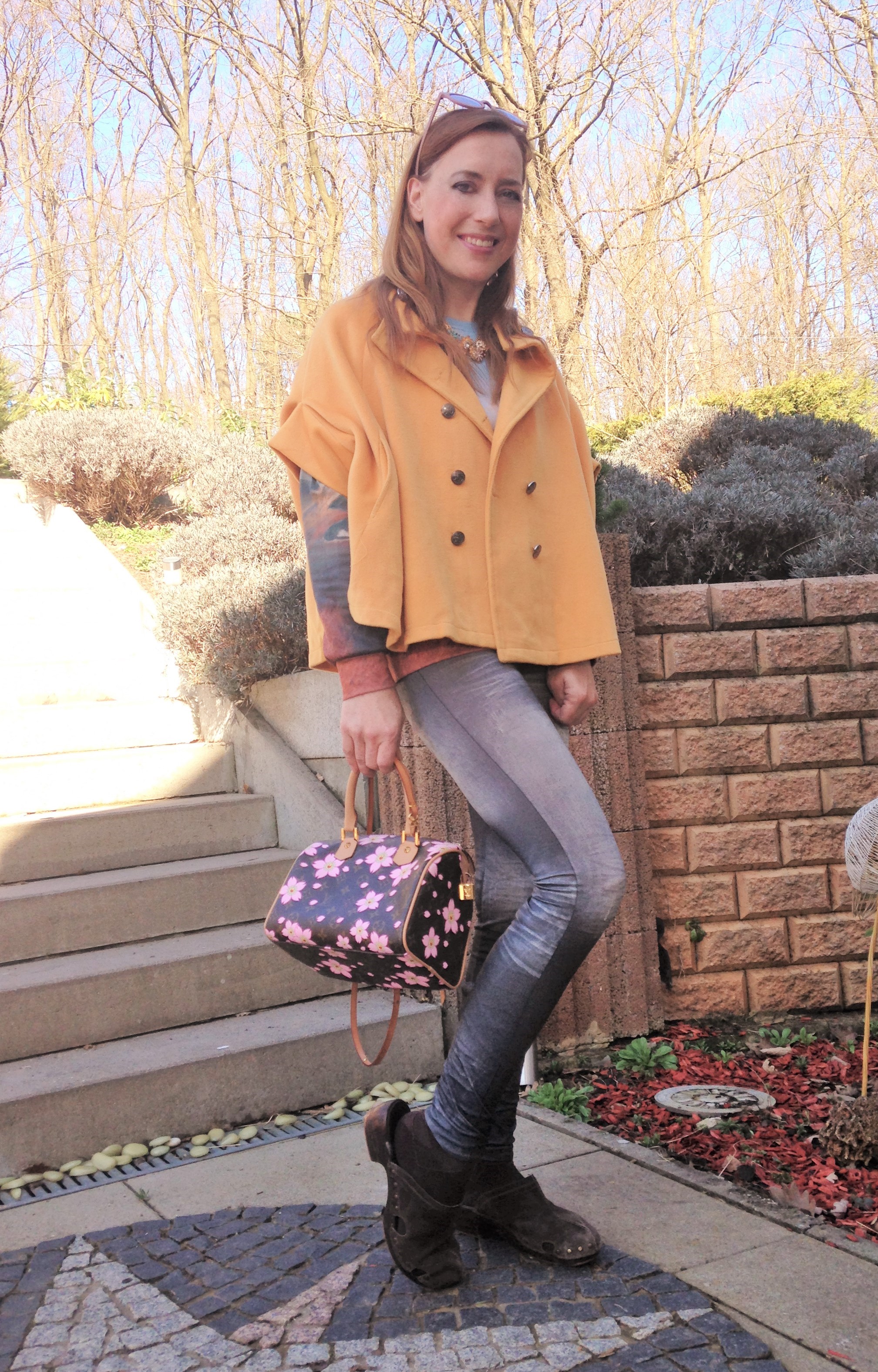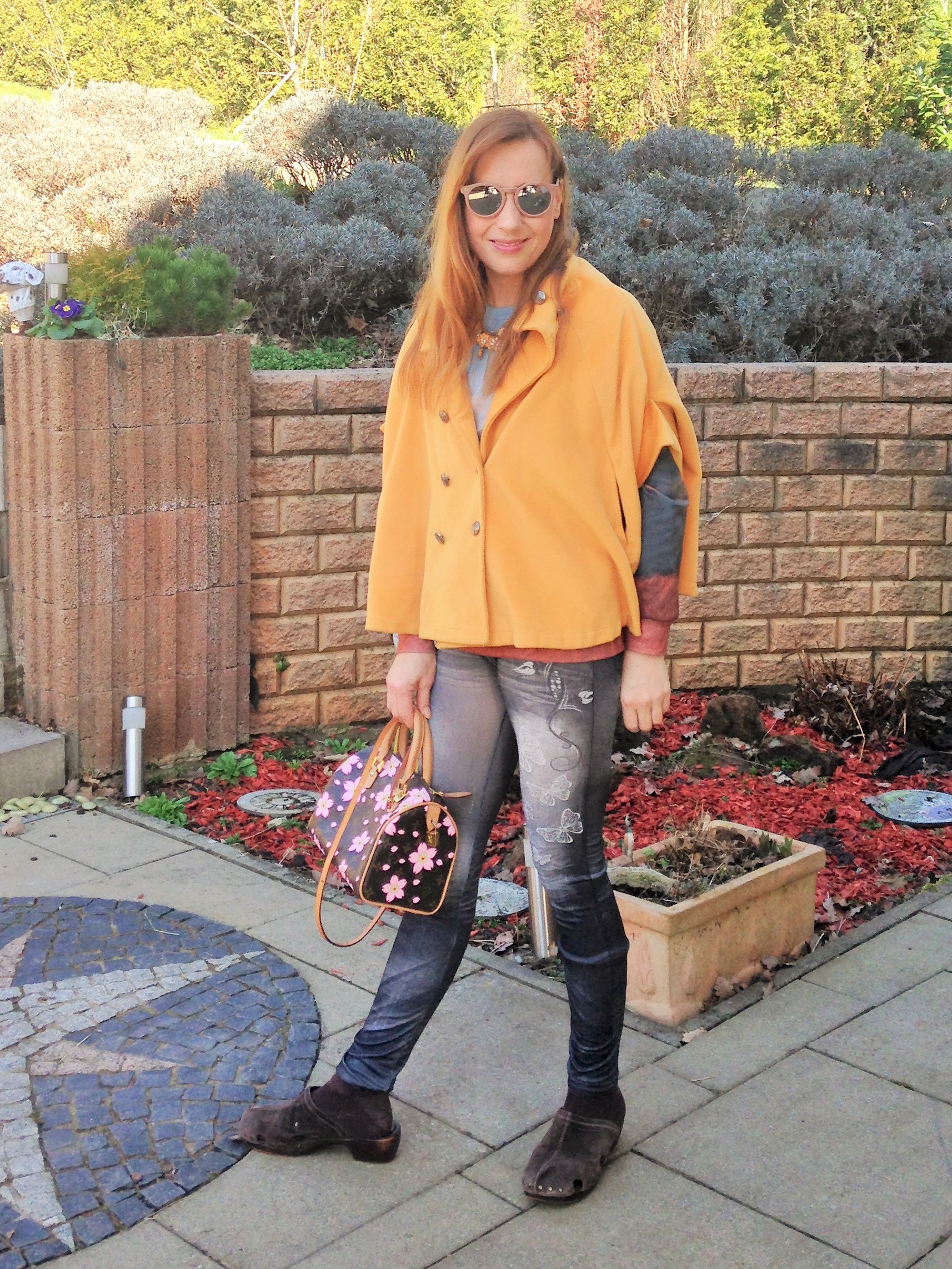 Das Cape aus Wolle ist leicht und es passt einiges darunter. Die Farbe macht fröhliche Laune. Auf Lookbook ist schon ein früherer Look mit ihm kombiniert – man sieht, wie variabel es ist.