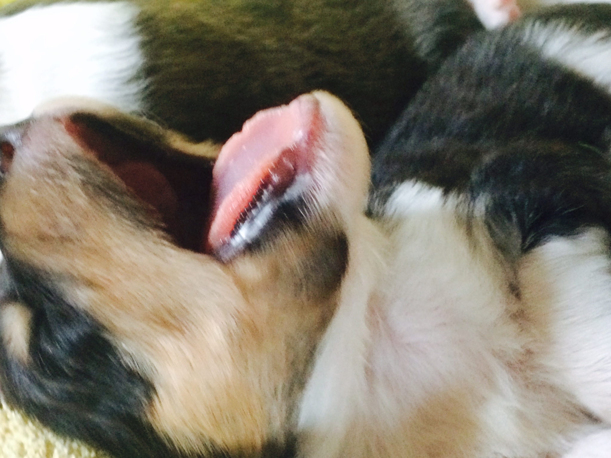 I made the porridge in a saucer and put it on a towel after the „normal breast feeding“. Aimée loved it and the puppies nosed it and wondered what this yummy stuff could be. The puppies are allowed to eat it as soon as they are 3 weeks old. When it was not soft enough, I added a bit of water and stired it until it had a good texture. This pot was empty very quickly. Afterwards I cleaned everything and Aimée began with her massages. When everything had been finished and the busy mommy had been going to the garden, the satisfied babies were lying in their box. Later on Aimée relaxed and lay under my desk in the darkness…