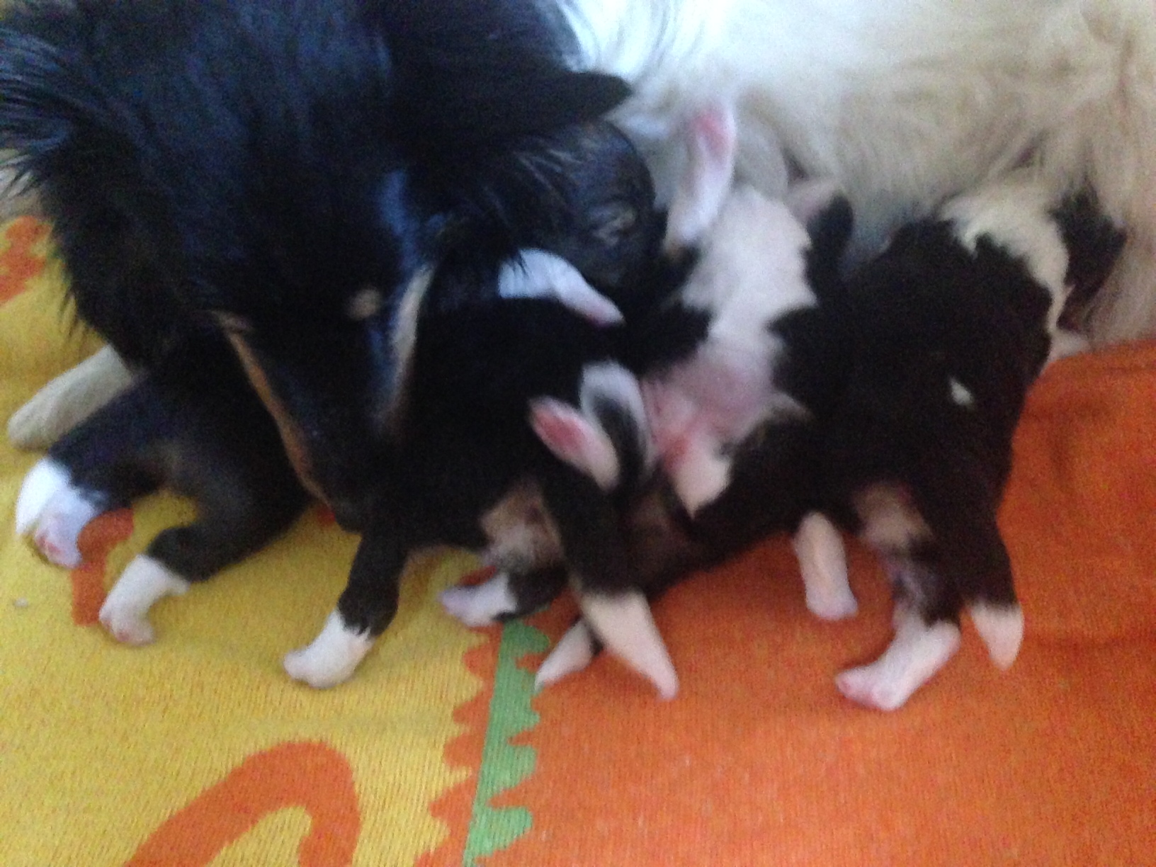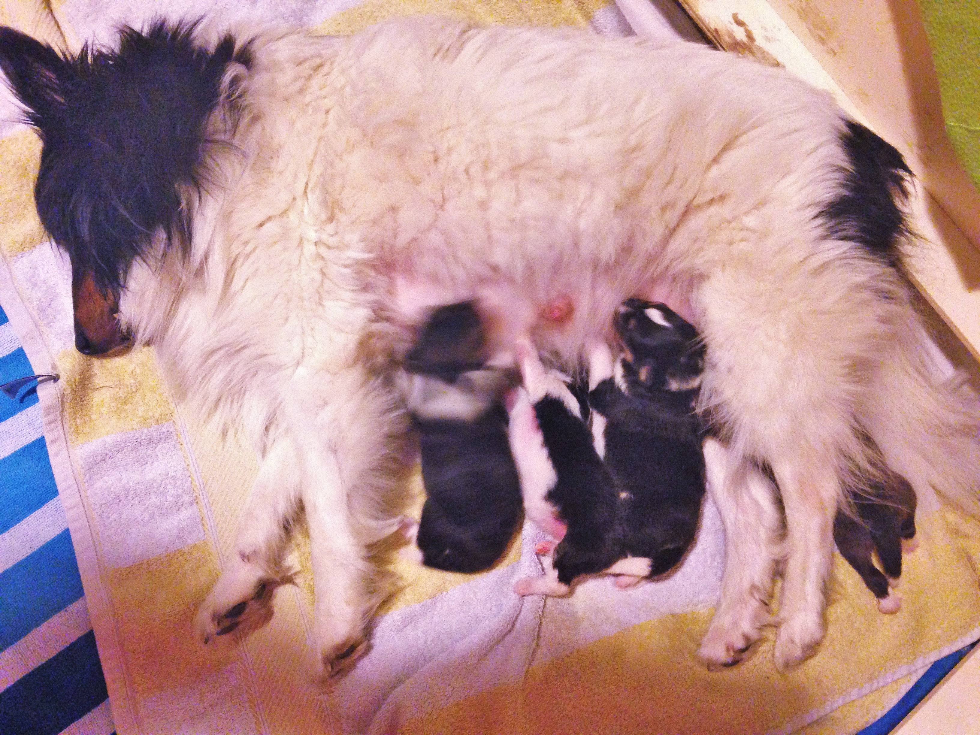 We waited until the first baby (Nelly, the smallest one) was born and then we switched places to the confortable puppy-box with infrared light and clean towels. Furthermore, we had bought a coloured collar for every puppy. After that, I called my husband and close friends of us – they wanted to see the delivery too (later on, they surprisingly decided to keep one of the cuties…). Aimée tried her best, but sometimes she would seem a little bit unsure – then we would help her with the next step. She seemed grateful for our support. We took care the babys learned as early as possible to drink, and when the next baby came, we checked if our girl would need some help. 4 babys were born in about one hour and 40 minutes. After their brave mom Aimée fed and cleaned the babies, she went into the garden. It´s important that after every feeding the little ones be massaged by the motherly tongue, otherwise they get problems with their digestion.