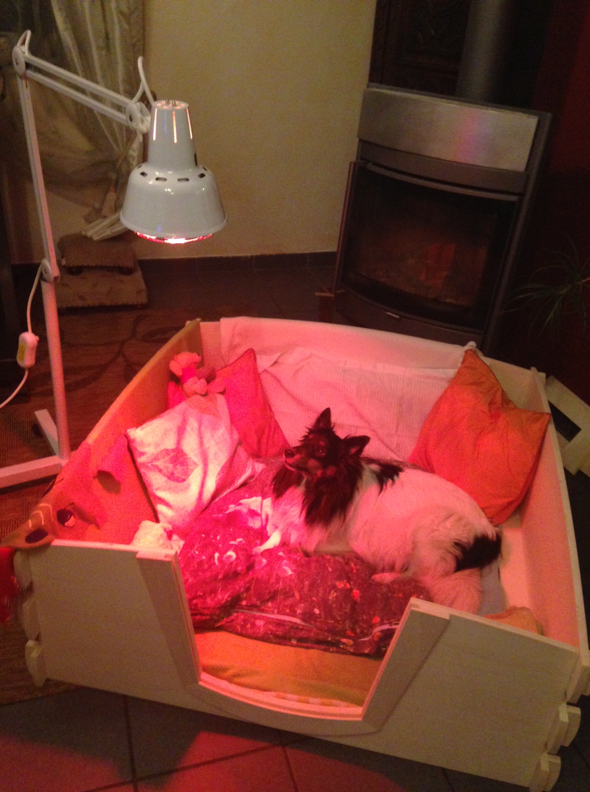 Another word of advice? Buy a good wooden puppie-box, you will really need it. The wall must have a narrow board projecting onto the inside and about 15 cm over the ground. This will allow the puppies to crawl under it to protect themselves, if there is not enough place between mom and wall. Also you should buy an infrared lamp to warm the puppies when it´s cold outside. The puppies hate to feel cold and get ill quickly.