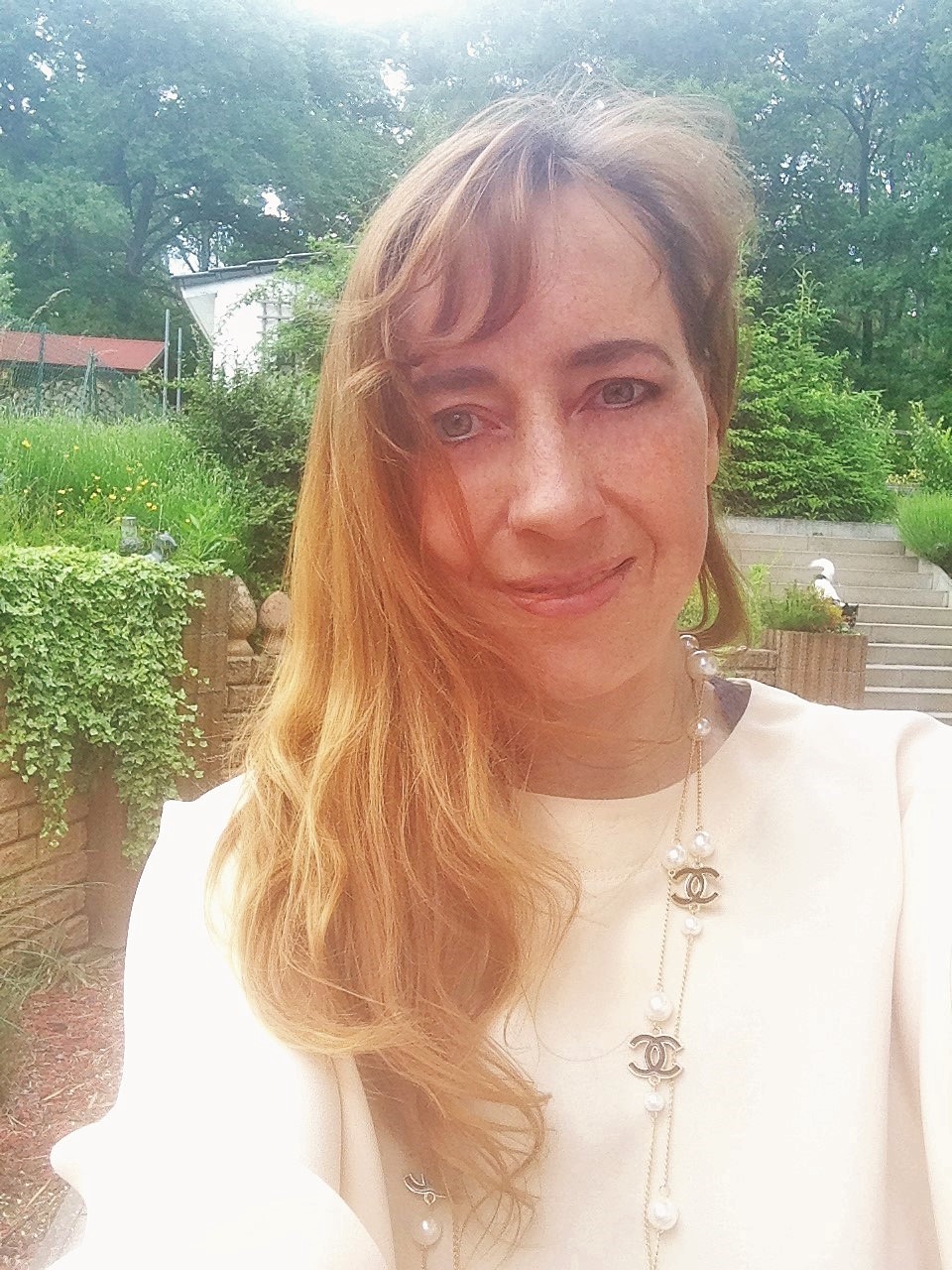 The Makeup is very light. But I use a foundation to cover my wreckels a little bit. I accentuate my eyebrows also, naturally they are a little bit too bright, especially in summer. Today, I prefer to use natural looking colors to create this nude look. It´s a color between peachy and rose for my lips and cheeks…
