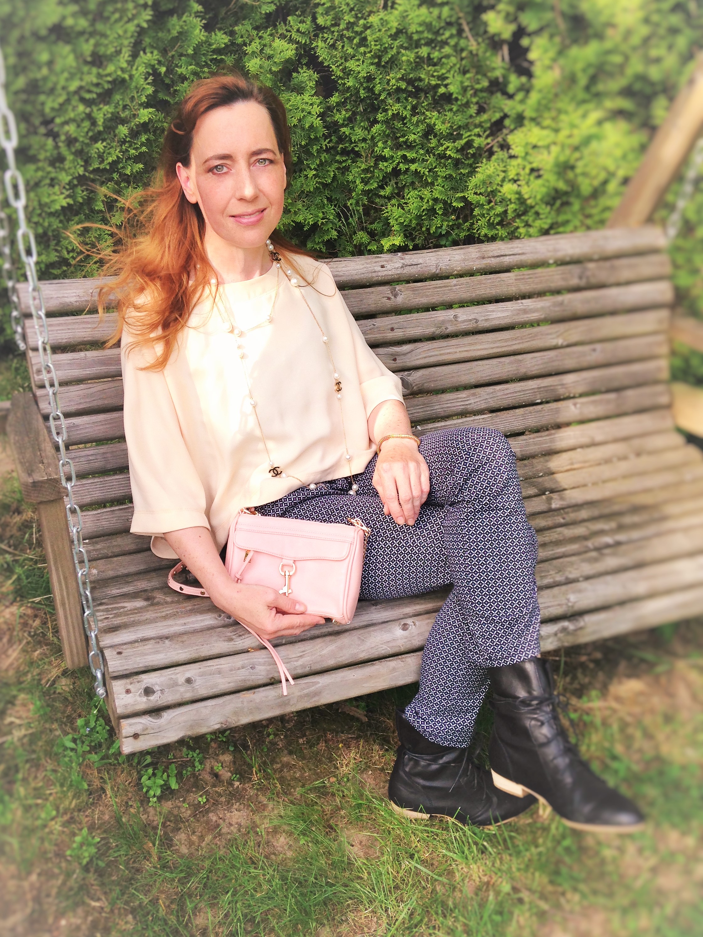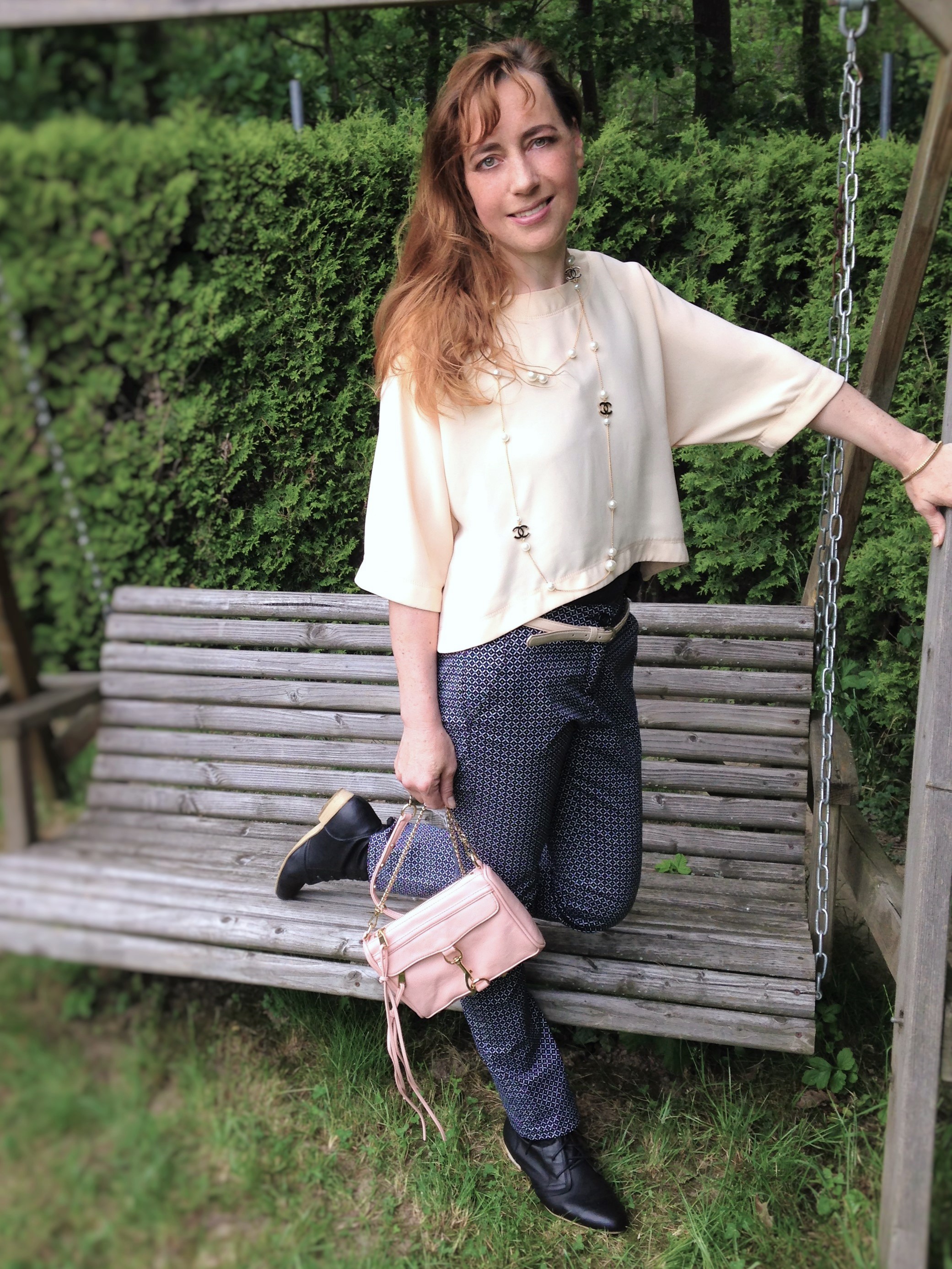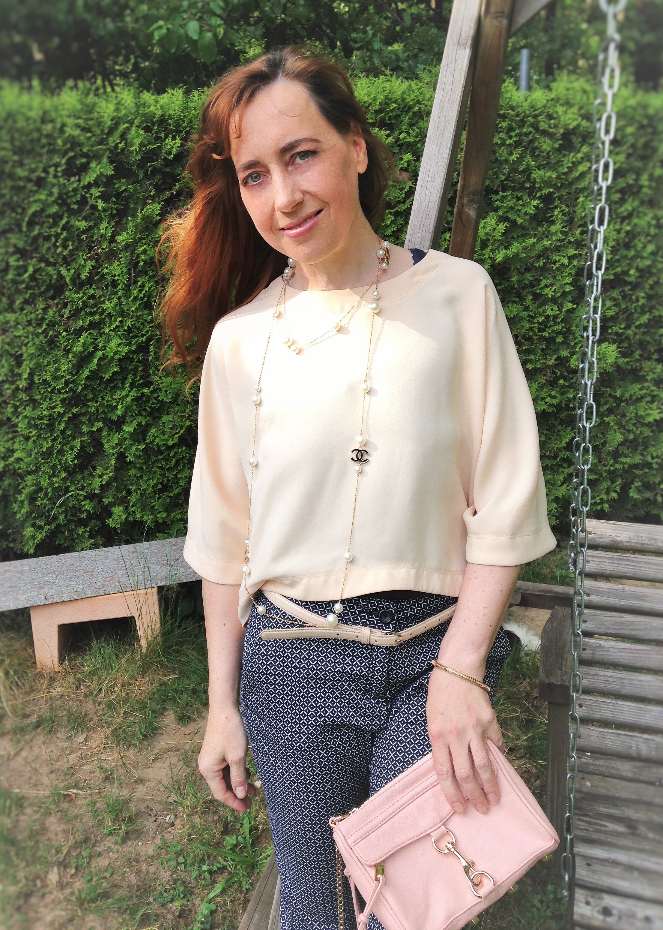 I wear a light wide blouse in salmon-pink. It is from Zara. I love the material, it´s a bit heavier but also soft and light and you don´t have to iron it. It´s from this year, perhaps you can still find it.