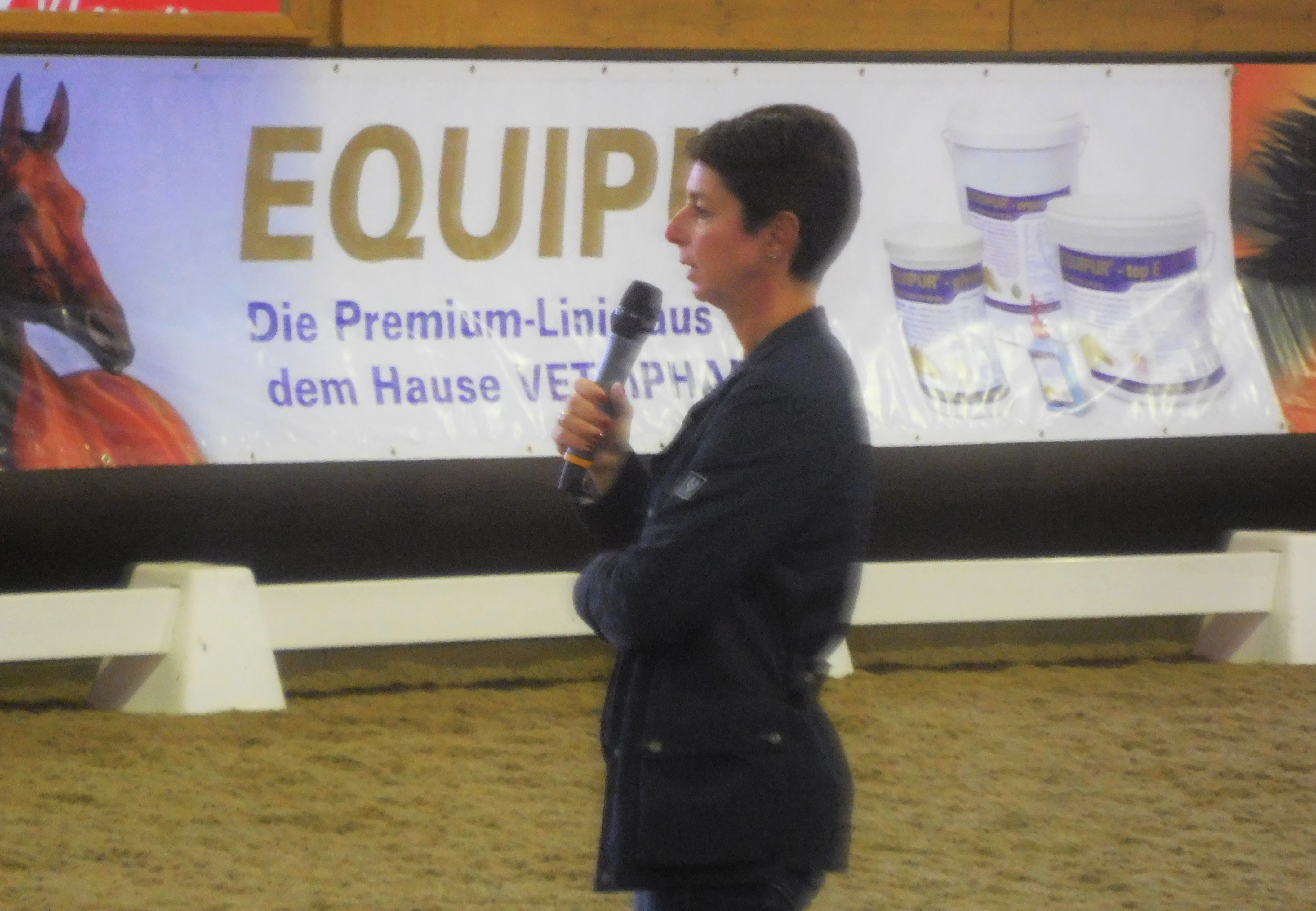 Nach einer kurzen Einführung wurde im Vorprogramm etwas über die neue Versicherung des Unternehmen „Berns“ berichtet.  Interessant fand ich, dass es nun, unter anderem auch, wie für Autos, „Rundum Sorglos“ Pakete für Reiter und Pferde gibt. D.h. wenn etwas passiert, hilft die Versicherung mit der Beschaffung des Tierarztes etc. Es wundert nicht, dass man natürlich auch das Pferd an sich versichern lassen kann…
