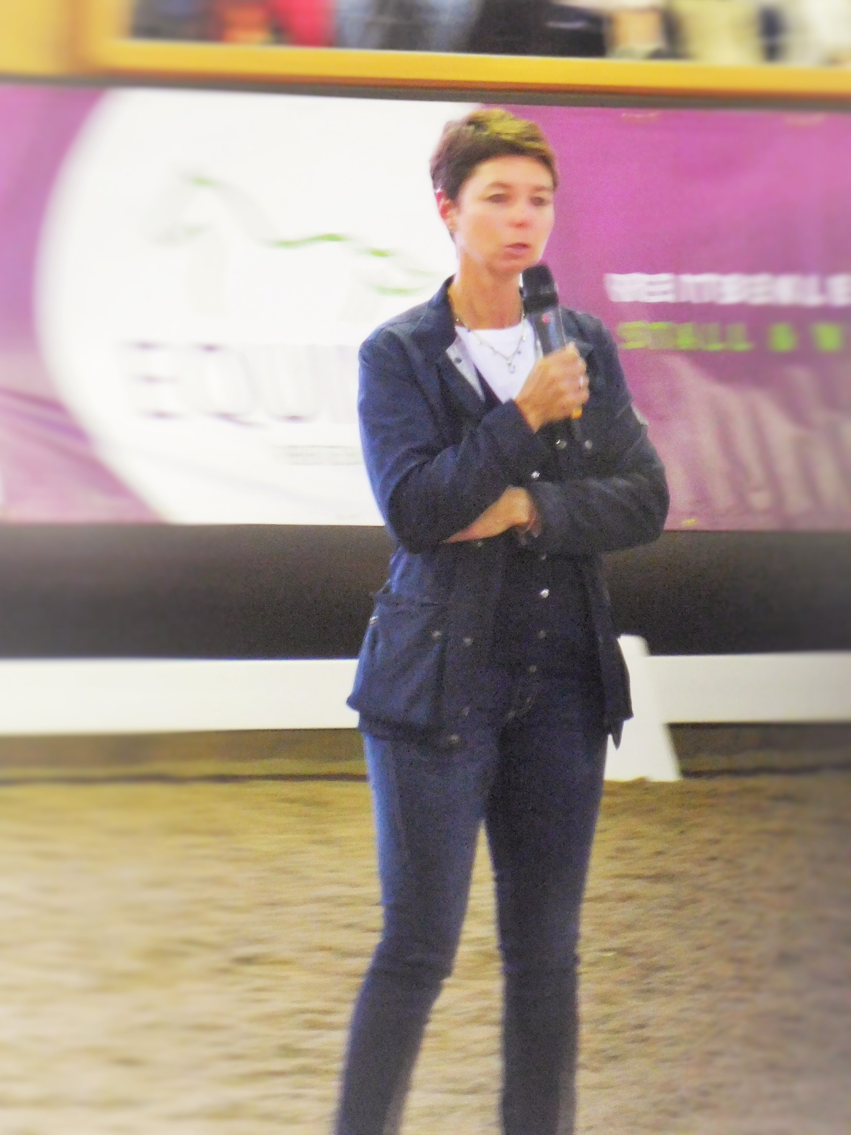 Also beschloss ich, mich einfach dieser Perfektion hinzugeben, für diesen Abend meine unvollkommene Realität  hinter den Toren zu lassen und  in diese schöne, „neue“, feingeistige Welt einzutauchen….DSCN0186Als eines der ersten bekannten Gesichter sah ich gleich Arlette Jasper-Kohl  (unten im Bild bei der Einführung) in schicker, aber keinesfalls übertrieben mondäner Reitkleidung, die mit ihrem Mann, Professor Edwin Kohl,  die Anlage geplant hatte. Ihre Ausbildung  als Innenarchitektin kam ihr bei der Realisierung ihres Traumes sicherlich zugute… Sie befand sich in angeregter, fröhlicher Unterhaltung mit der „Grand-Dame“ der saarländischen Dressurreiterei, Ulrike Lautemann, heute einmal ohne ihre Hunde und an diesem warmen Tag ganz in sommerlichem Weiß gekleidet. Sie gehört zu den alterslosen Menschen, die ihr absolut  integerer Charakter jung erhält. Auch hat sie schon versucht, mich und meine Stute auf Vordermann zu bringen… Obwohl wir zwei nun nicht gerade  Madita Zurheide und Sir Oliver sind. Diese sind, nebenbei erwähnt, ihr neuestes Dreamteam am Dressurhimmel…