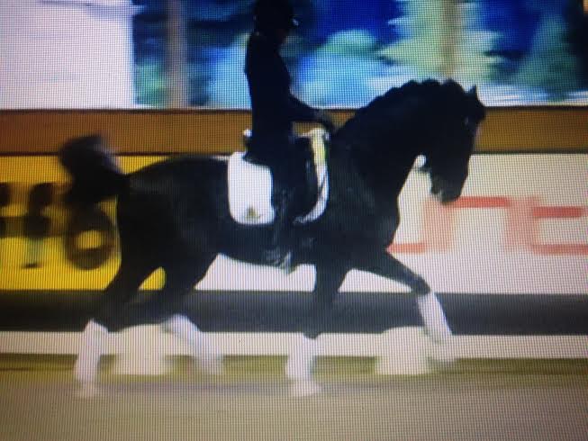 Foto 2 (10)Als zweites betrat der relativ starke, gekörte Rapphengst Quentano, geritten von Madita Zurheide die Bahn. Er war am Anfang in der fremden Halle noch ein wenig aufgeregt und fand sein Spiegelbild  so beeindruckend, dass er sich an der Spiegelseite auch gerne einmal zuschnaubte, was auch das Publikum sichtlich erfreute. Das probate Mittel von Frau Theodoresco bei diesem Pferd: Immer wieder hielt sie Zurheide zum Übertreten und später zum Außengalopp an, was das Pferd dann doch ein wenig forderte und bald zu der angestrebten inneren und äußeren Losgelassenheit führte. Der fliegende Galoppwechsel klappte dann auf beiden Händen problemlos, wobei jeder, der schon versucht hat, diesen einem Pferd beizubringen, weiß, dass es oft anfangs nur auf einer Seite gut klappt,… Der Hengst  aber war bei Allem mit Freude dabei und zeigte eine große Präsenz mit einer schönen, erhabenen Galoppade im Handgalopp, der auf eine gute Versammlungsbereitschaft schließen ließ. Man muß nicht erwähnen, dass auch das Angaloppieren im Außengalopp auf Anhieb klappte. Es wäre aber unfair, den  beeindruckenden Trab unerwähnt zu lassen.  Genug geplänkelt, kurz gesagt: Ein Anwärter auf „ganz Großes“ …