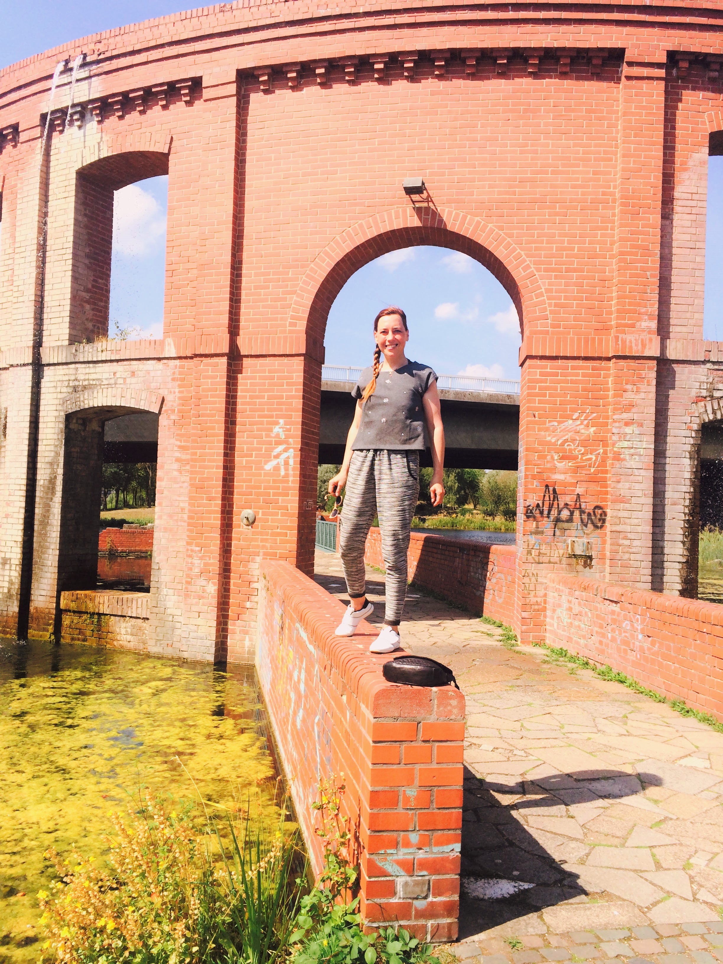 unnamed (12)Das Ganze wirkte etwas skurril. Irgendwie wie eine Mischung aus Ruinen, Kunstwerken und Park. Die Baumanordnung erinnerte an die Tuilerien in Paris. Links der Bäume war eine Halfpipe (kann ja gefährlich sein, siehe oben, aber bestimmt auch lustig…), eine Schanze und „Hindernisse“ (nennt man das so?) für Skater und/oder Rollschuhfahrer.unnamed (5)Es war ein schöner Ort , zumindest an diesem Nachmittag. Ruhig, sonnig und durchdrungen von Erinnerungen, die ich nicht kannte. Geht es Euch auch  so, dass es für Euch Orte gibt, an denen Ihr spontan überlegt, was wohl dort schon alles passiert ist?  Vor 10, vor 100 oder vor 1000 Jahren … ?unnamed (20)Aber ich kann nicht nur romantisch sein, sondern bin natürlich auch pragmatisch! Der Kontrast der rötlichen alten und neuen Mauern würde sich ganz vorzüglich als Kulisse für meinen Schwarz-Grau-Weiß-Look, in dem ich heute gekleidet war, eignen! Schon zückte mein Mann den Fotoapparat…  Da die Sonne schon ein wenig an Kraft verloren hatte, es also nicht mehr ganz so heiß wie in den letzten Wochen war und ich außerdem im Falle eines Falles (im wahrsten Sinne des Wortes) meine Knie beim Fahrradfahren wenigstens etwas geschützt haben wollte, trug ich eine melierte Hose, kombiniert mit einem kurzärmeligen grauen Sweatshirt mit kleinen Blümchen-Applikationen aus Steinchen darauf. Um das Ganze nicht zu überfrachten, hatte ich als Schmuck nur eine kleine zarte Kette aus Roségold mit einem winzigen Strass-Anhänger in Form eines Schmetterlings umgelegt.Damit ich beim Fahrradfahren nicht danebentreten oder mir die Schnürsenkel in die Pedale kommen würden, hatte ich meine weiß-schwarzen Sportschuhe mit Klettverschluss an. Dazu trug ich meine geflochtene kleine Umhängetasche, die Euch mittlerweile nicht mehr neu, aber einfach unheimlich variabel, praktisch und auch einfach SCHÖN ist. Ein echtes Lieblingsstück eben…