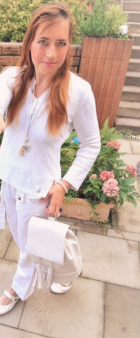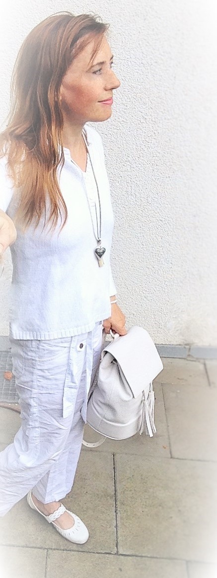 Nun aber zu den wirklich wichtigen Dingen: Du siehst einfach hinreißend aus mit Deinem bezaubernden Lächeln und Deinem wunderschönen weißen Look! Besonders gut gefällt mir der süße Rucksack. Und um die Schuhe beneide ich Dich. Ich glaube, immer Pumps oder High Heels tragen zu müssen und bezahle diese Eitelkeit des öfteren mit schmerzenden Zehen oder Blasen. Wie man sieht, können auch bequeme flachere Schuhe sehr chic aussehen …