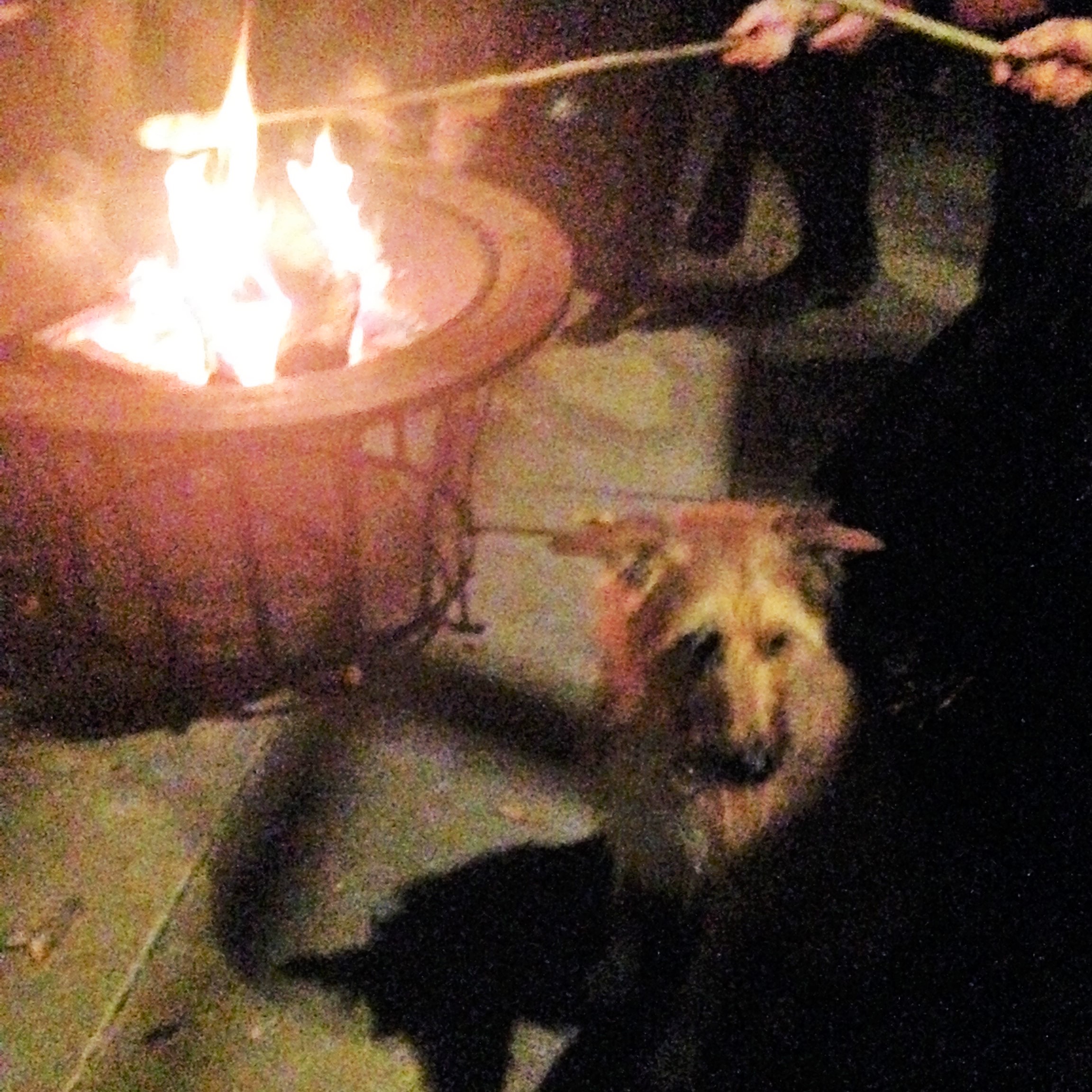 Leo am Feuer, Bella ist schwarz, auch sie war „Gast“, leider entstand kein brauchbares Foto… Aber ich möchte ja den Hunde-Fans keine Infos vorenthalten!
