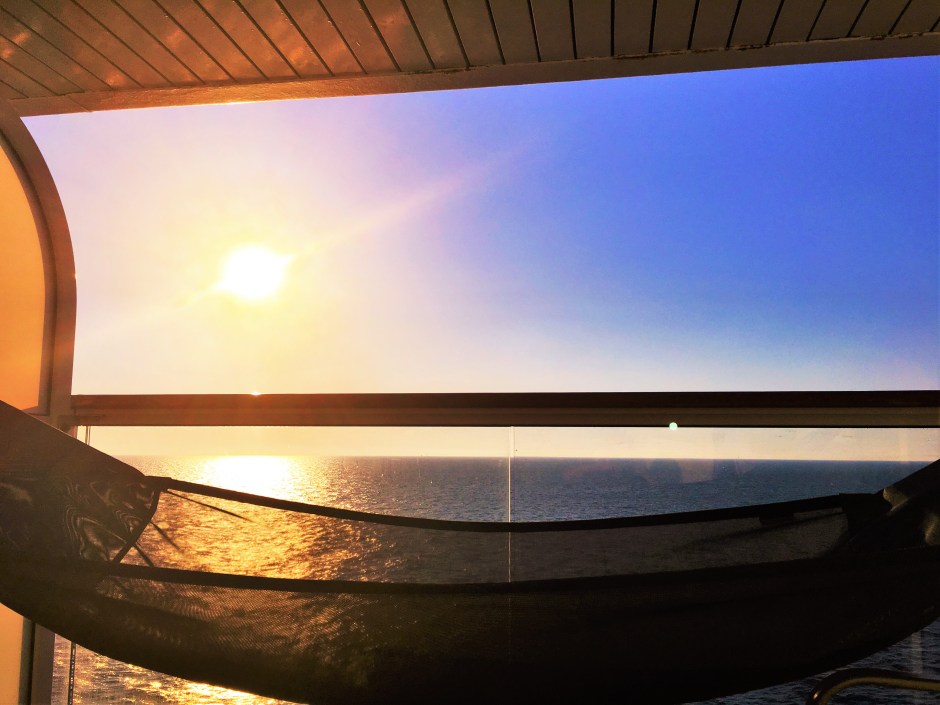 IMG_6591 (2)Die Kabine ist durchdrungen von einem fast überirdisch gleißend hellem Licht, als ich vorsichtig durch die schlaftrunkenen Lider blinzle. Ich blicke direkt aufs Meer, das das goldene Licht der Sonne reflektiert, als ob Millionen Swarowski Steine auf ihm schwimmen würden…