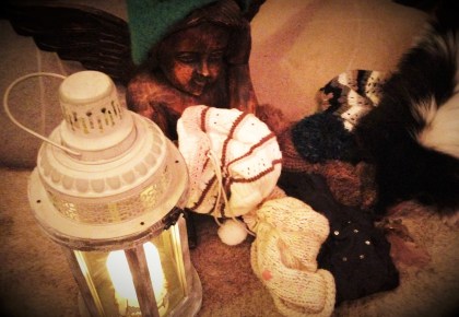 Der Holzengel in der Denkerpose sieht aus, als würde er sich über soviel Mützen wundern – wo doch eh nur eine zur selben Zeit auf den Kopf passt. Auch das Hündchen schnüffelt argwöhnisch – was sollen diese „Eindringlinge“ ? Eigentlich würde man ja wirklich nur „eine“ brauchen…