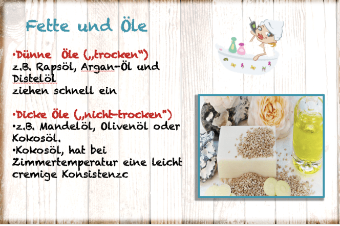 Dazu kann man nun zum einen als Fettanteil (lipohile Phase) Öle (siehe unten) oder Duftöle von möglichst natur-reiner Herstellung geben, denn bei schlechter Qualität oder empfindlicher Haut kann es zu Reizungen kommen.