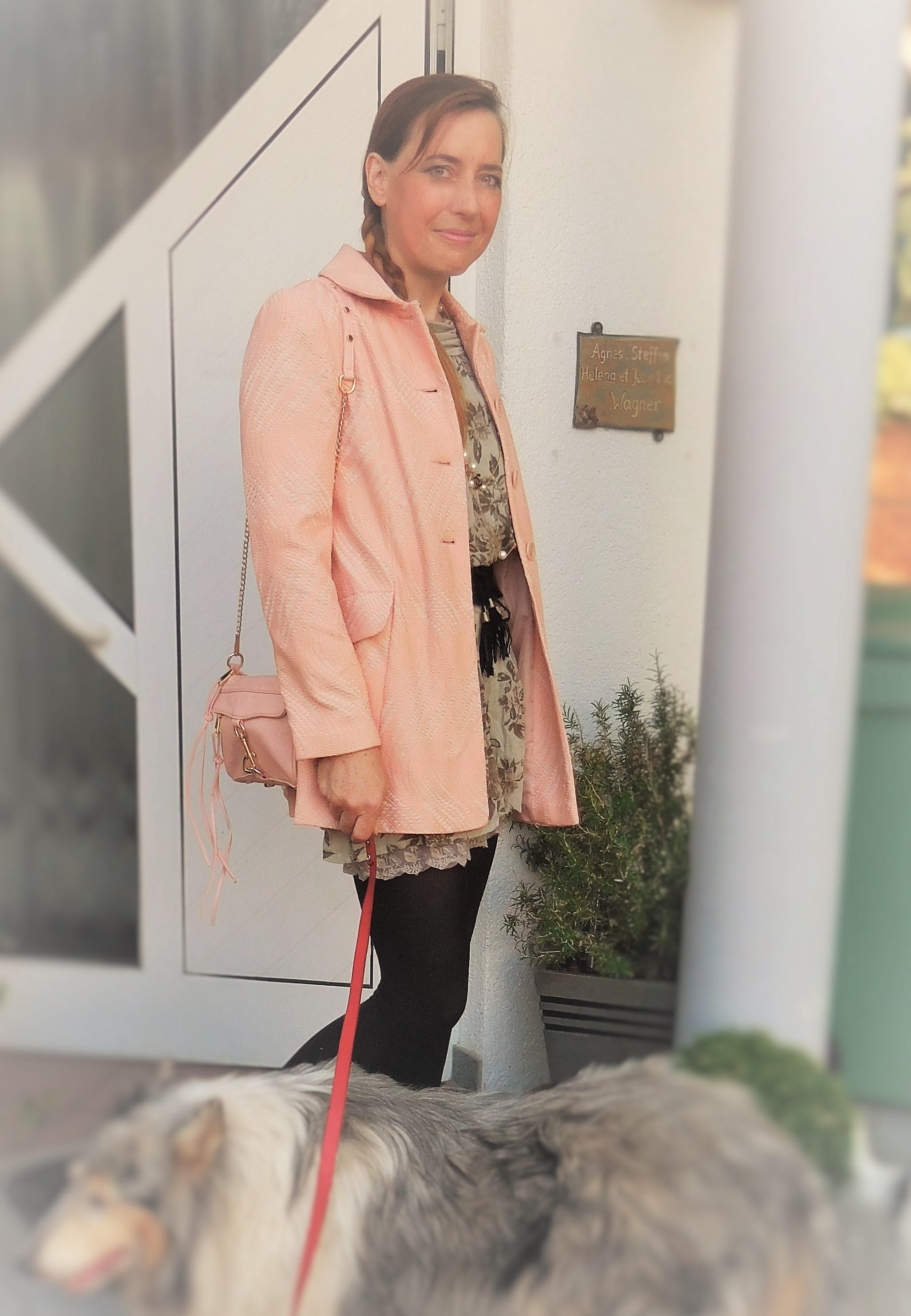 Die Farben Taupe mit dem romantischen Rosen-Muster und das zart-frische Abricot sehen auch bei etwas blasserer Haut gut aus, geben aber auch ein wenig Kontrast. Schwarz wirkt oft sehr hart. Wird es nicht durch Accessoires  abgemildert, wirkt meine Haut oft ein wenig verhärmt. Reine Nude-Töne hingegen bringen wenig Kontrast. Wenn es nicht optimal kombiniert wird, komme ich mir vor wie eine Riesen-Pellwurst.  Da die Grundfarben stimmen, kombiniere ich nun mit Schwarz. Es stimmt, dass je dunkler die Farbe gewählt wird, umso schlanker die Wirkung des „Inhalts“ ist. Diese Wirkung ist leider physikalisch erwiesen. Also – her mit den dunklen Strümpfen für endlos lange Beine! Auch der Gürtel und die Schuhe sind farblich abgestimmt.DSCN0032 (3) Das Kleid mit seinem weichen, leichten Knitter-Stoff und dem gerafften Kragen ist schon relativ kurz, daran ändert auch der Rüschensaum nicht viel. Trotzdem ist er ein netter Hingucker. Durch die blickdichte Strumpfhose wirkt es aber trotzdem noch „züchtig“. Meine Empfehlung: Tragt den Saum so kurz oder lang, wie Ihr findet, dass es (noch) gut aussieht und Ihr Euch wohlfühlt! DSCN0049 (3) Der sommerlich-frische Mantel ist ein echter Allrounder. Er passt zu vielen verschiedenen Kleidungsstücken und wirkt niemals wuchtig, obwohl er weit geschnitten ist. Er ist knitterarm und leicht, sodaß er auch toll zum Vereisen ist. Ein solches oder ähnliches Stück empfehle ich als Basic in jedem Schrank. Wem die Farbe zu soft ist, kann auch einen Grau-Hellblau oder Beigeton wählen!