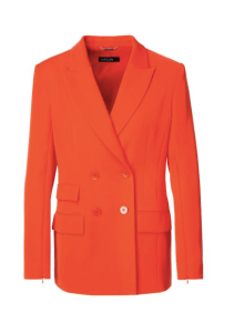 Grüner Hosenanzug mit Taillierung und campari- farbene Kombination aus doppelreihigem Blazer und kurzer Hose , Label und Bildnachweis: Marc