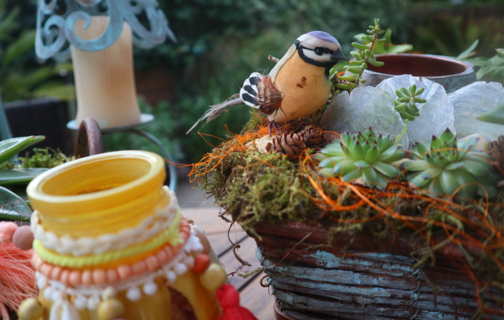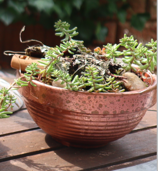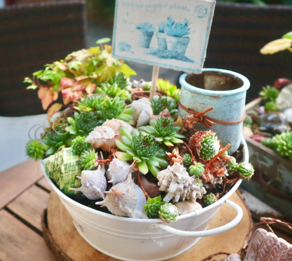 Geht zuerst einmal in Eure Schuppen, Speicher, Keller, Küchenschränke … und holt heraus, was ihr an geeigneten Gefäßen finden könnt. Sie können sowohl klein als auch komisch, klobig oder fein, vintage oder modern aussehend sein – wichtig ist Eure Vision! Come on! Alte Holzkisten, Schalen, Töpfe, kleine Gießkannen oder Körbchen von Ostern, aber auch Schubladen können, ein wenig verschönt oder auch ,,en nature“ klasse aussehen! Farbe, ein paar Schnüre oder Blätter mit Heißklebepistole angebracht und schon hat ihr einen kunstvollen Blumenbehälter, auf den jeder Florist neidisch wäre! Denkt auch daran, dass nicht alle Gefäße wasserdicht sind, was eigentlich gut ist, weil sich dann keine Staunässe bilden kann, wobei das eines der wenigen Dinge ist, die Sukkulenten überhaupt nicht mögen. Dann braucht Ihr aber noch einen Teller oder ein anderes Gefäß zum unterstellen, vorausgesetzt, Ihr wollt mit Euerem Arrangement das Haus dekorieren oder es auf einen Tisch auf der Terrasse stellen.
