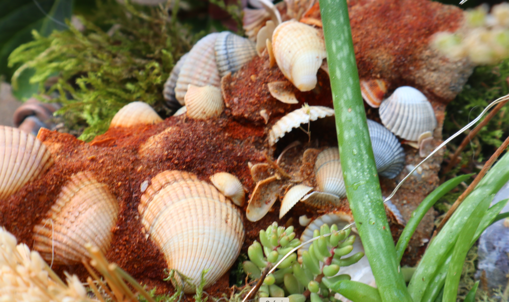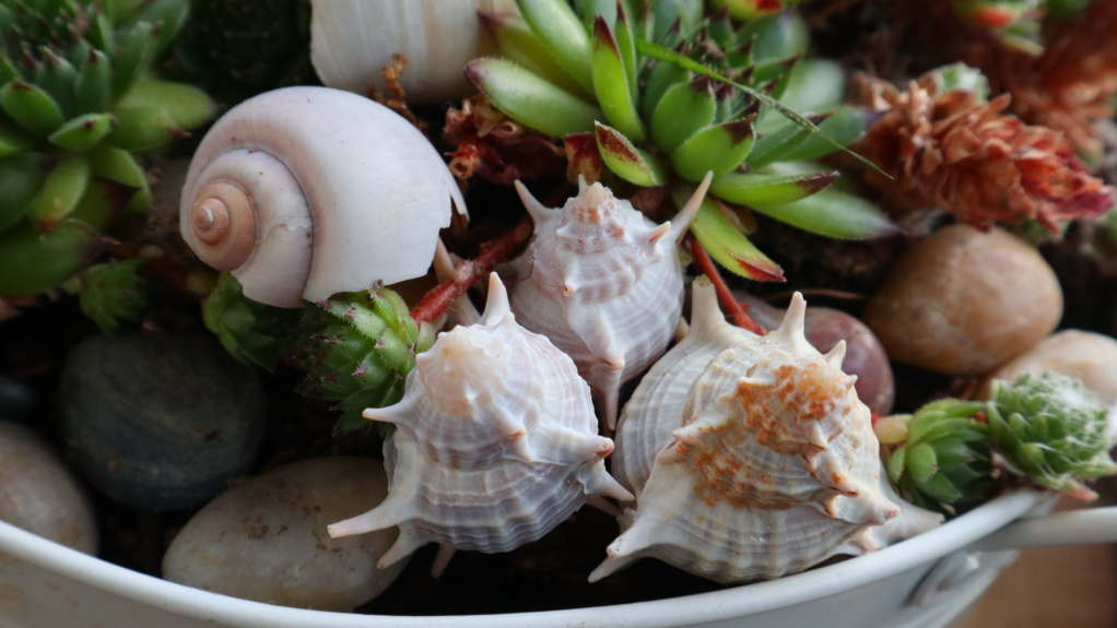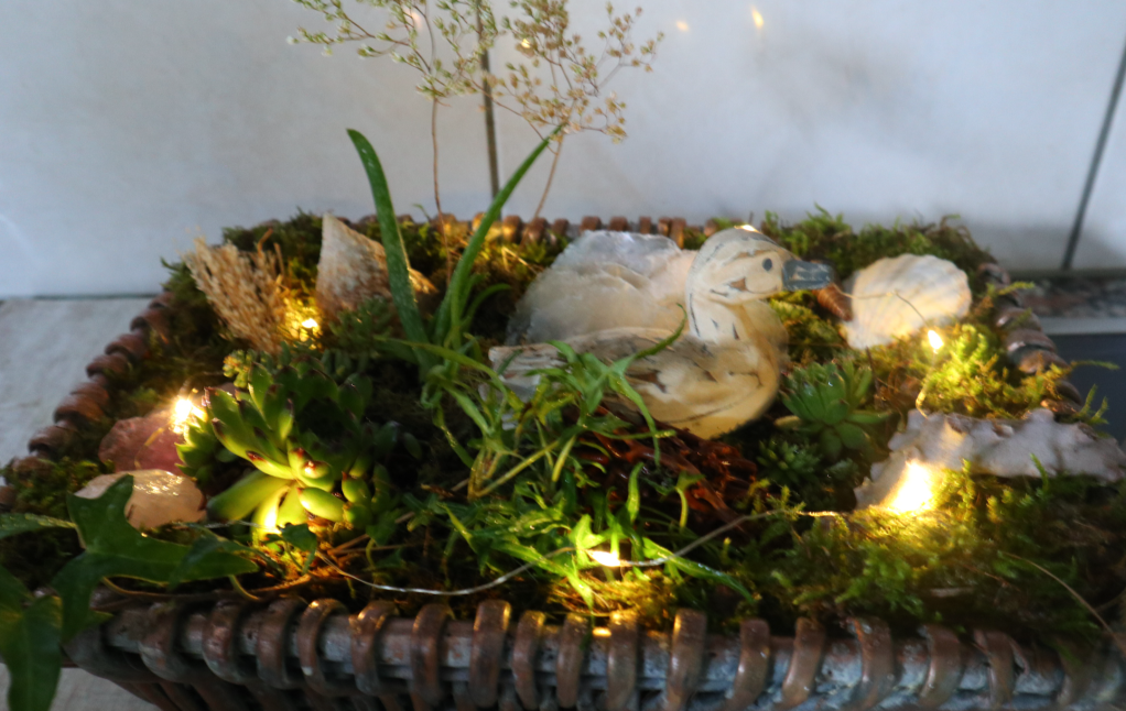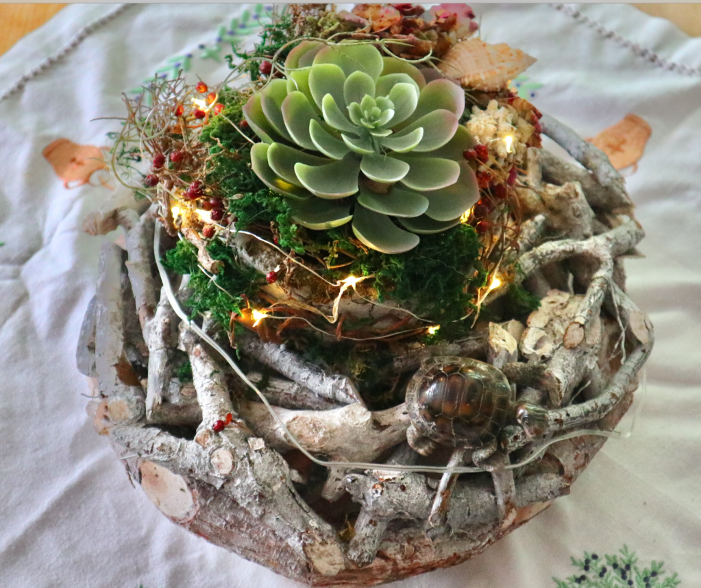 Lichterkette in einer mediterranen Sukkulenten-Welt. Außerdem habe ich eine kleine Aloe vera und Zier-Efeu integriert, die den Landschaftseindruck verstärken. An Grund-Deko haben ich Amethysten (links) und Muscheln nebst einem Fächer aus Muschelblättern (im Hintergrund) benutzt. Mit einem geschnitztem Vogel, Muscheln, Steinen und Gräsern wurde das Ganze komplettiert.