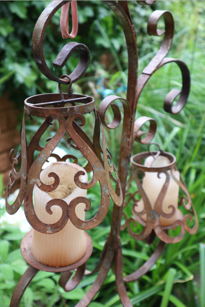 Schon sind mein Blumenpötte trocken und ich schnappe mit einen Schwamm oder Pinsel für die Kreidefarbe, die mit lockerem Handgelenk dezent und dünn auf der Bronze verteilt wird. Einer bleibt allerdings bronzefarben, ein anderer wird fast komplett hellblau. Und weil ich grade so schön dabei bin, male ich den Kerzenständer auf dem Tisch und die verrosteten Laternen auch gleich noch ein wenig mit an. Kann ja nicht schaden, wenn alles so ein wenig zusammenpasst …