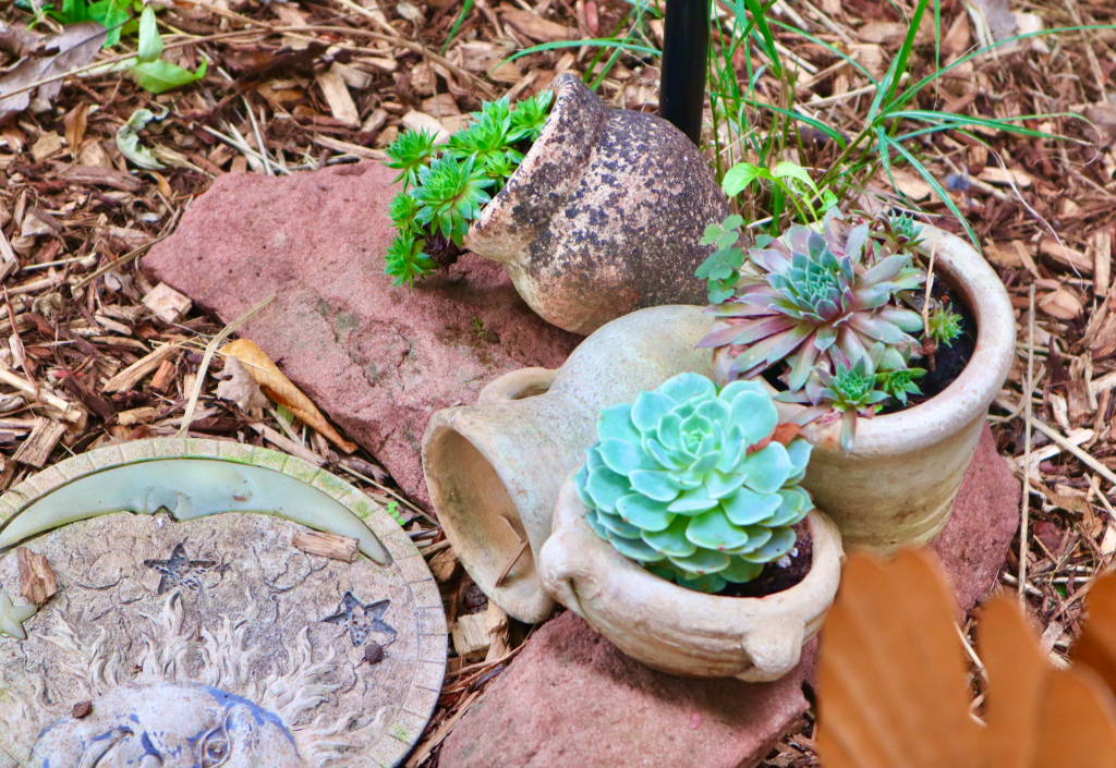 Auch im Garten lassen sich unschöne Ecken wie hier im Schatten, wo eigentlich kaum etwas wächst, mit Sukkulenten und ein paar Steinen vom nächsten Acker schnell aufhübschen. Allerdings muss man bei solchen Töpfchen ab und zu etwas Erde nachfüllen, da sie mit der Zeit durchs Wasser ausgewaschen wird.