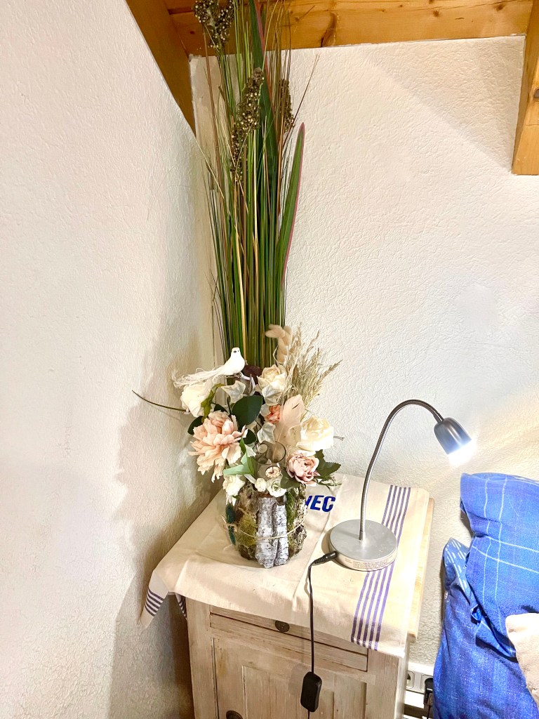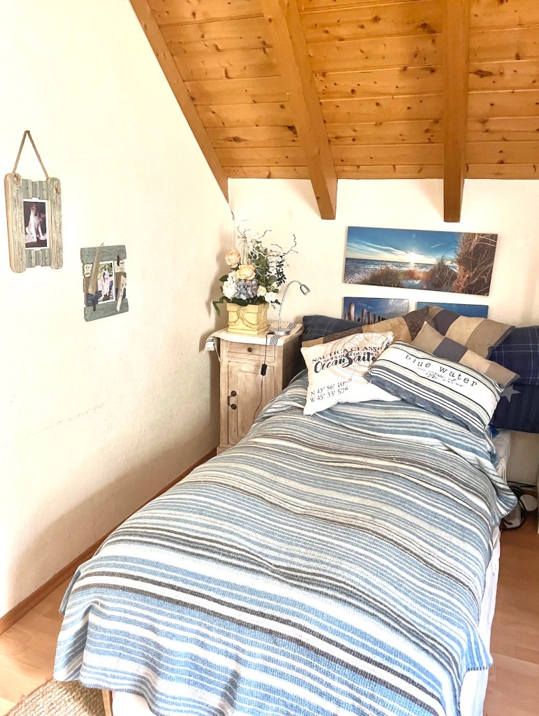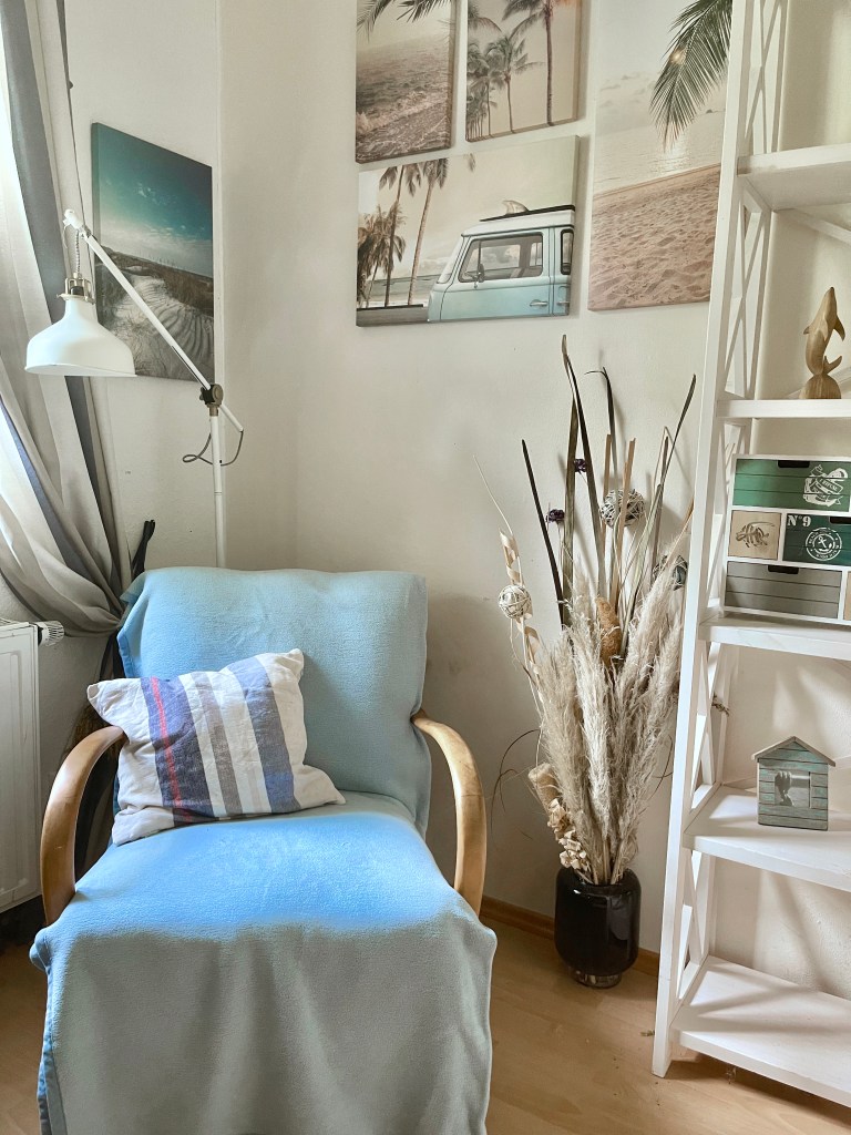 Aber seht einfach selbst: Konsequente Blau-Weiß-Sand-Töne, ein Sand-farbener Jute-Teppich, ein blauer 50 er Sessel, ein luftig wirkendes weißes Regal, ein weiß gekalktes Nachtschränkchen von Flohmarkt, Treibholz-Bilderrahmen, ein geschnitzter Delphin, eine Deko-Muschel, eine maritime Kiefer, Gestecke, teilweise aus Natur-Materialien (Pampas-Gras, Baum-Rinde, Gräser und Moos) und viele Bilder unterstützen das maritime Flair, sodaß dieses Zimmer zumindest auf mich eine ruhige Gemütlichkeit ausstrahlt.