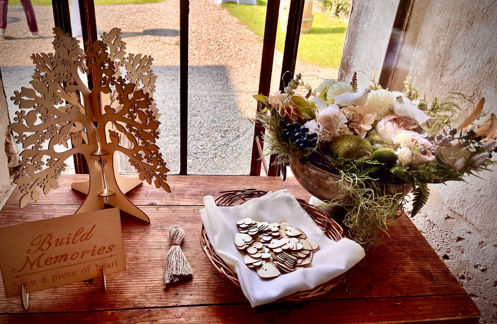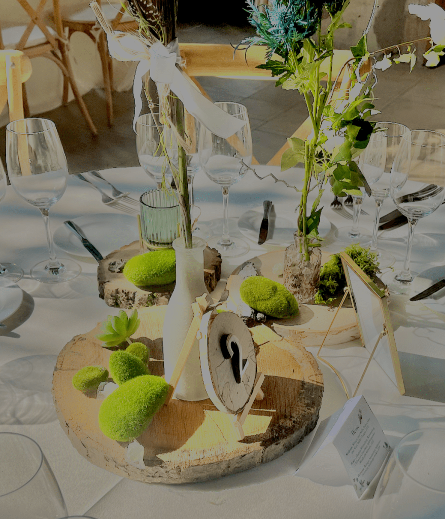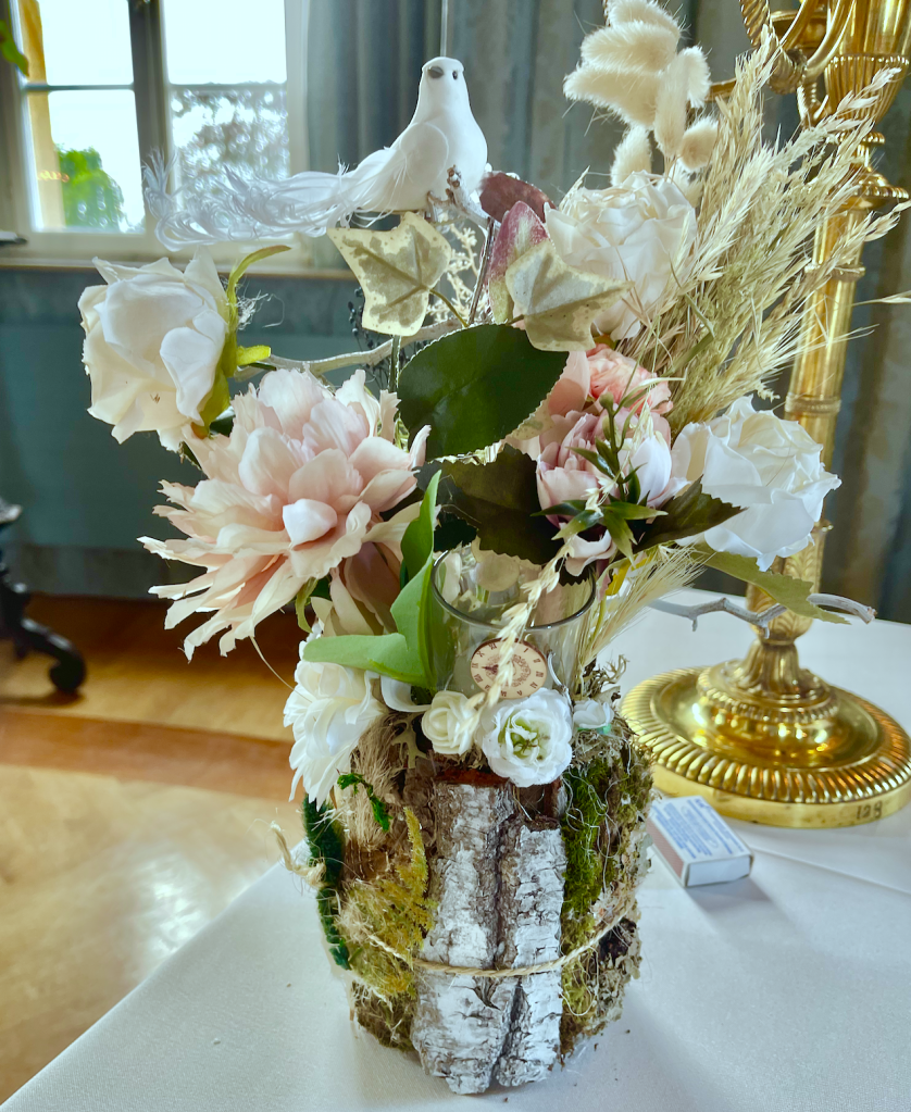 Die Deko haben wir zusammen selbst gestaltet. Das machte uns viel Spaß und das Angebot im Netz ist riesengroß. So mussten wir bei Formen und Farben sowie bei der Qualität keine Kompromisse eingehen. Außerdem habe ich rechzeitig Gräser, Moos, Rinden und Äste gesammelt und diese teilweise angemalt oder besprüht, um den gewünschten Look zu erhalten.