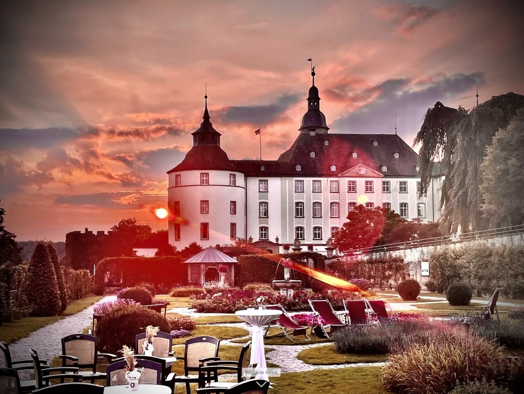 …lichtete sich am nächsten Tag der Himmel. Als dieses Foto entstand, stand die Sonne bereits tief und tauchte den Schlossgarten in verwunschenes Licht… Am Hochzeitstag wird er bei schönem Wetter mit Tischen, Sonnenschirmen, Liegestühlen, und Fackeln ausgestattet. Hier fand unser Sektempfang und das Kaffeetrinken mit Anschnitt der Hochzeitstorte statt.