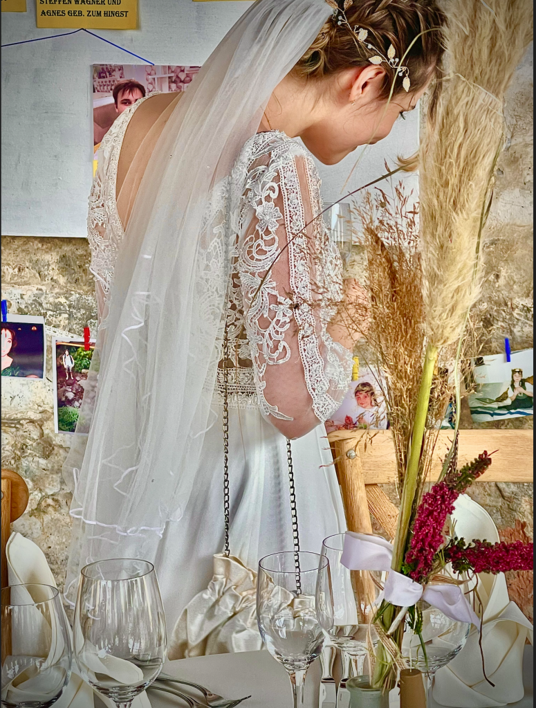 Die Ernennung eines Zermonienmeisters, der sich um die Unterbringung der Programmpunkte kümmerte und in der Einladung mit Anschrift benannt wurde, hatte sich übrigens bewährt. So konnte sich das Brautpaar um weitere wichtige Punkte, wie die ganze Organisation der standesamtlichen und eventuell kirchlichen Trauung, der Location und der eigenen Unterbringung, der Gästeliste, den Einladungen und der Tischordnung, des Hochzeitsfotografen, der Band oder des DJ, Dankeskarten und natürlich – last not least – den angemessenen Klamotten (die diesen Namen in dem Falle nicht verdienen) und der Brautfrisur samt Make up kümmern. Sicher habe ich einiges vergessen … Gerne dürfen mir die ,,Hochzeitserfahrenen unter Euch“ auf die Sprünge helfen!