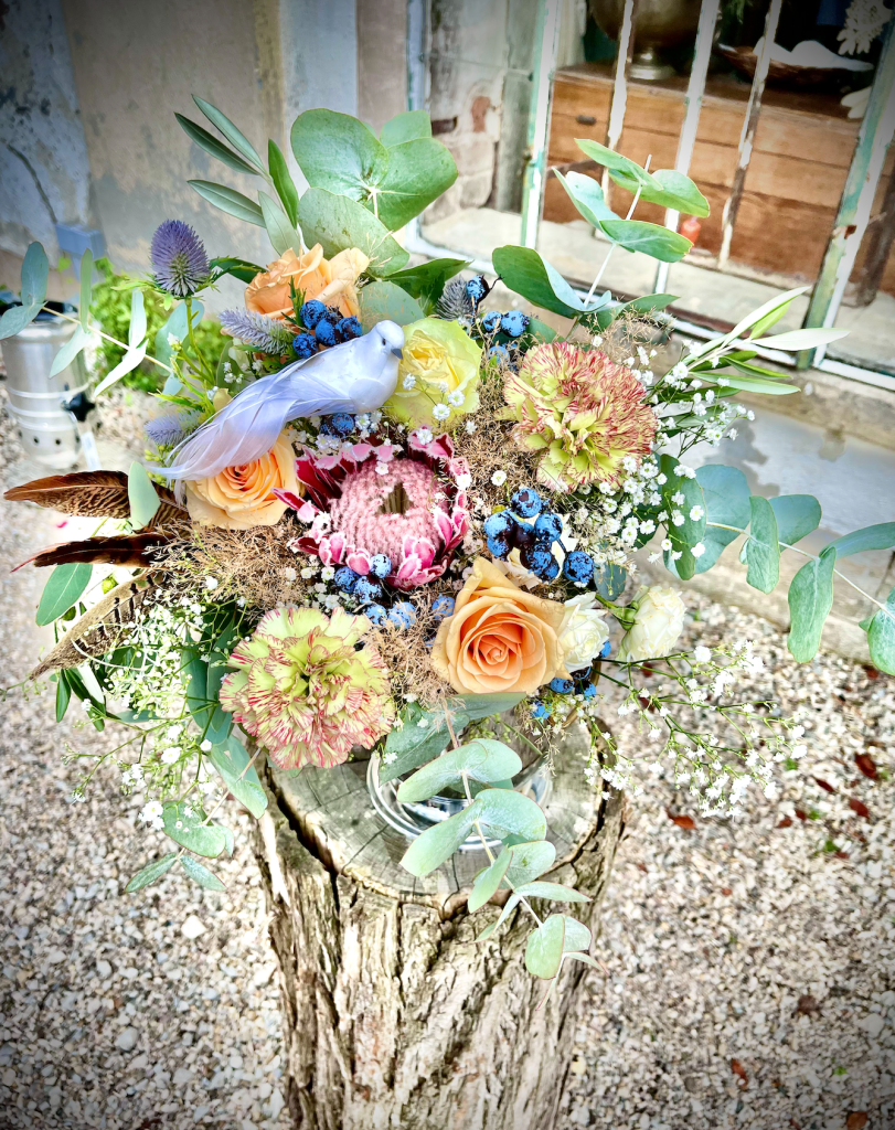 Der Brautstrauß mit Federn, Disteln, Heidelbeeren und der ,,Königsblume“ (Protea). Feine Wiesengräser und Schleierkraut dienten als ,,Füllmaterial“, an Grün wurde verschidene Eukalyptusarten und Olivenzweige verwendet. Dazu wurden verschiedene Rosenartenund zwei mehrfarbige Nelken verarbeitet.