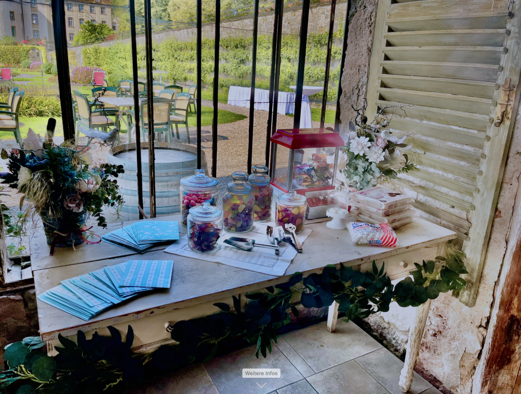 Was mich wiederum besonders freute … Was ich aber auch toll fand, waren die vielen Ideen und die Hilfe, die von allen Seiten kamen und die letztendlich dazu beitrugen, dass die Hochzeit in vielerlei Hinsicht ein ganz besonderes Fest wurde. So hatten wir so vielen kleinen Details geplant, dass wir sie tatsächlich an der Hochzeit selbst gar nicht alle umsetzten konnten. So kamen beispielsweise der ,,Glücksbaum“ wie auch der ,,Braut-Wurf-Strauss“ (der traditionell geworfen wird, damit ihn eine zukünftige Braut fängt) gar nicht zum Einsatz. Anfangs dachten wir das übrigens auch von der Candy-Bar, die lange unangetastet blieb. Aber als die Turmuhr Mitternacht geschlagen hatte, führte das anscheinend bei etwa zehn Leutchen zu einem rasanten Abfall des Blutzuckerspiegels, denn innerhalb 30 Minuten leerten sich sechs Kilo Süßigkeiten wie von Zauberhand …