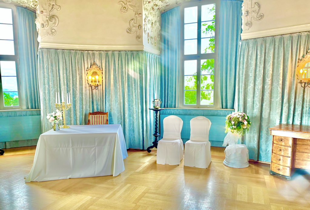 Der Vier-Jahreszeiten-Saal war bereits am Vortag fertig dekoriert! Wir testeten schon einmal, wie es sich auf den Brautpaar-Stühlen sitzt …