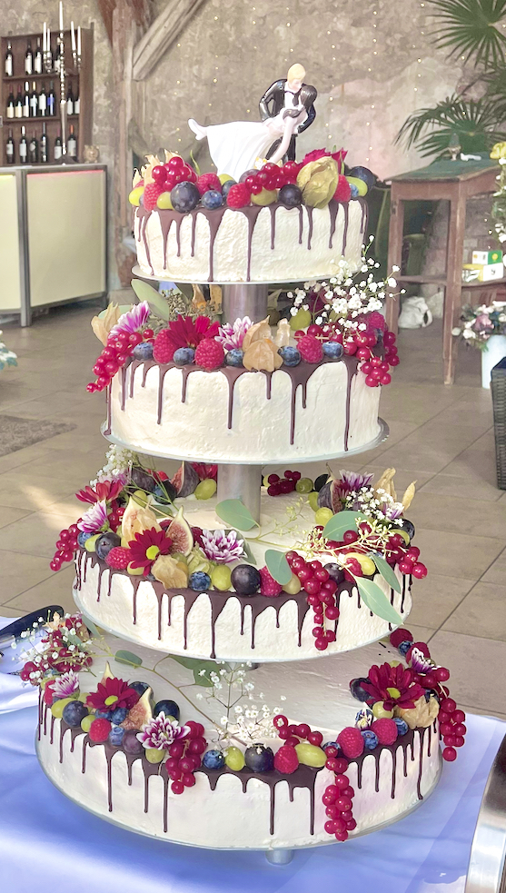 Die Hochzeitstorte- ein Prachtstück aus Mascarpone-Sahne, Früchten unf Schoki …