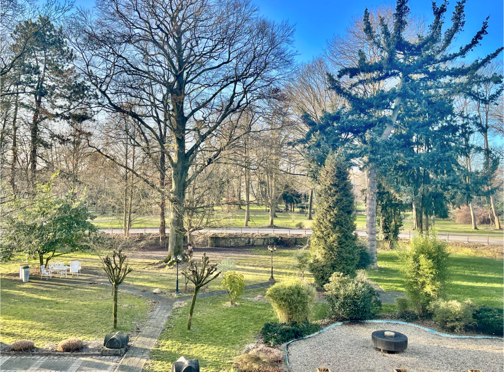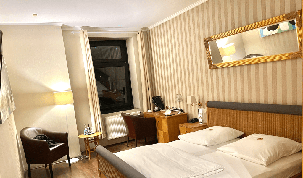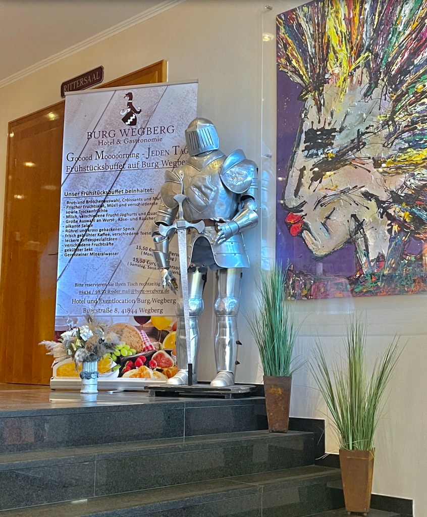Wenn man über die Brücke mit dem Burggraben durch das majestätische Tor zur Burg Wegberg gefahren ist, fällt der Blick sogleich auf das historische Anwesen zur Linken, während auf der rechten Seite der dazugehörige Park mit den schönen, alten Bäumen zum Flanieren einlädt. Das Gepäck kann man quasi vor der Eingangstür ausladen, was ich als sehr angenehm empfinde, weil meist die Parkplätze direkt vor der Burg verfügbar sind. Wenn man diese dann betritt, wird man nicht nur von einem der herzlichen Mitarbeiter des langjährigen Teams der Burg begüßt, sondern auch, stilecht, von einer von einer Ritter-Rüstung.