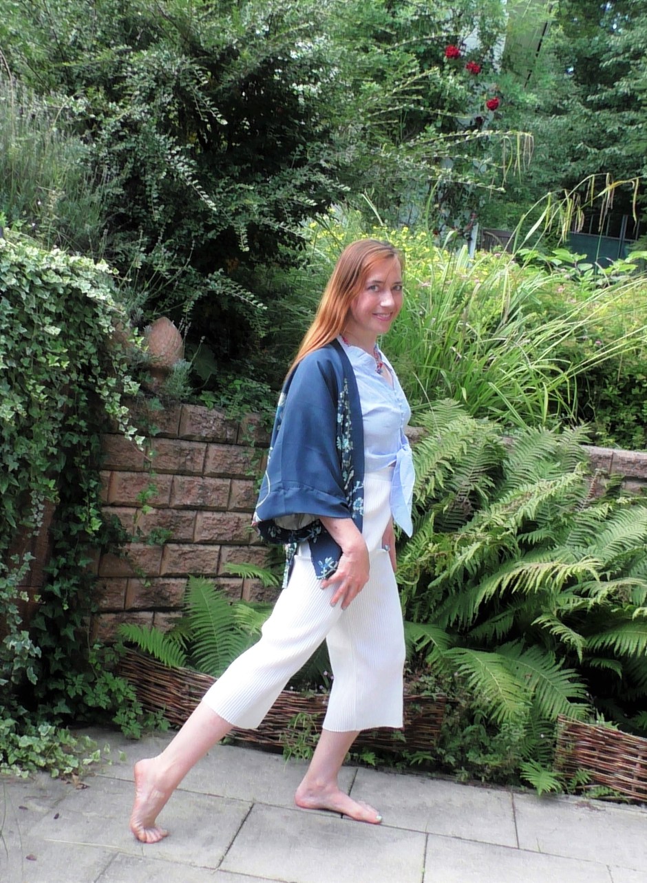 Ist deshalb ein heller, freundlicher mit einem schönen chinesischem Muster auf dem Kimono, der positiv und leicht ist – So wie ich mir das Leben wünsche… Ich bin barfuß und spüre den Boden unter mir, die plissierten Culottes sind mega-bequem und das leicht knittrige Baumwoll-Blüschen mit den zarten, überzogenen Knöpfen hat einen wirklich weichen Stoff, weil er nicht tausendmal durch irgendwelchen Appreturen gezogen wurde…es wird vorne geknotet und hat Trompetenärmelchen…