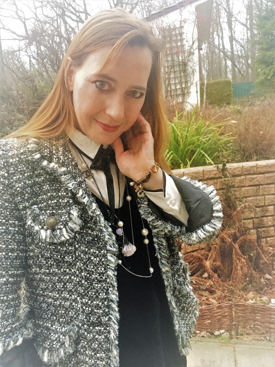 Deshalb zeige Euch heute meinen festlichen Look im Chanel-Style… Oben ganz brav mit Schleife, Perlen- und Coco-Kette und unten im sexy Minirock… Natürlich darf etwas aus angesagtem Samt nicht fehlen, deshalb kommt auch mein neu erstandenes Samt-Top zum Einsatz! Das hat sich als sehr bewährt herauskristallisiert, weil es ein wenig wärmer ist als die Bluse alleine! Wie immer sind die Schuhe dazu so bequem, dass ich mir keine Fußschäden meiner bumperl-gesunden, zugegeben leicht qudratischen Füße während des Abends einheimse!
