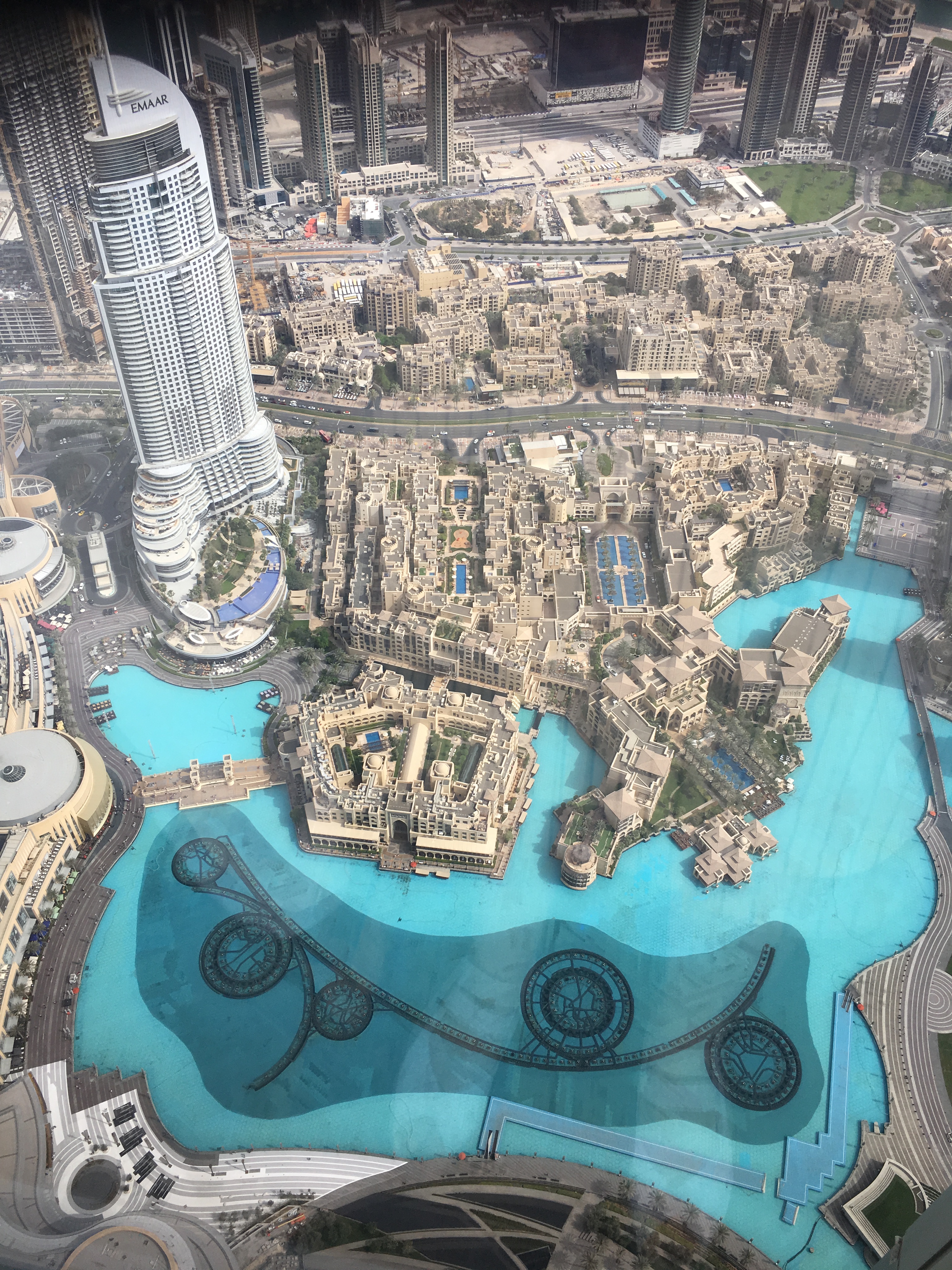 … Okay, man kann auch das höchste Gebäude der Welt erklimmen beziehungsweise in etwa einer Minute (!) mit dem Aufzug nach oben auf den Burj Khalifa fahren und über die Weite der Stadt und der Landschaft blicken, die nur durch eine leichte Diesigkeit, die in Dubai seltsamerweise meist herrscht, etwas eingeschränkt ist!